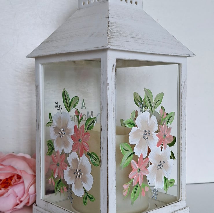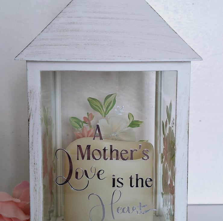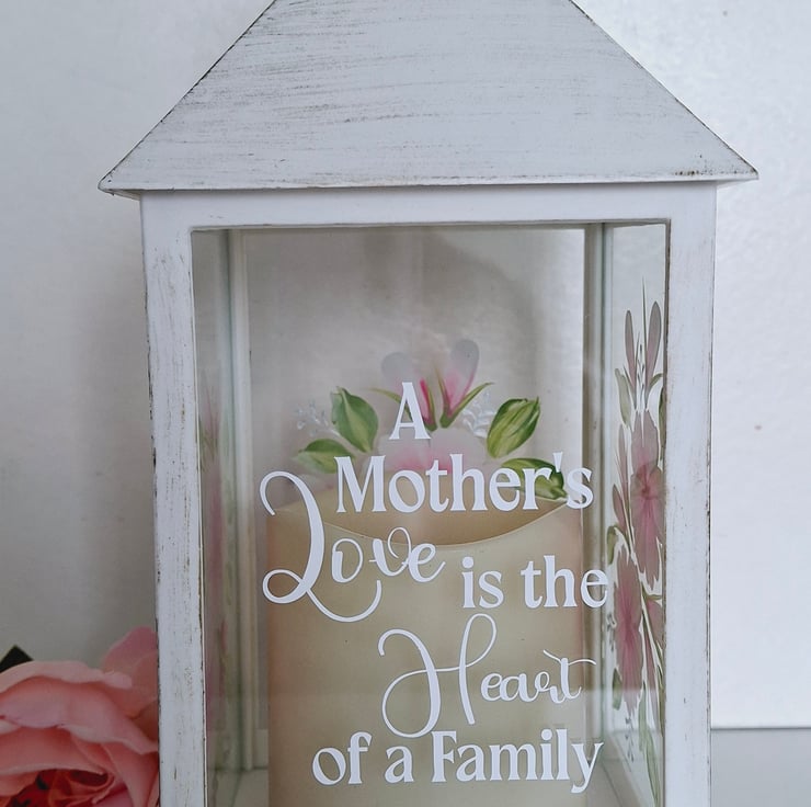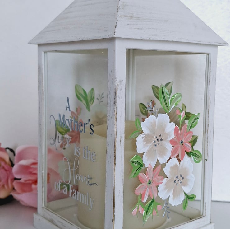 This Ivory distressed effect battery lantern has been hand painted on all 3 sides with a pretty floral design in peachy cream colours. It has a lovely quote on the front about Mum being the heart of a family. A really wonderful gift to treasure.