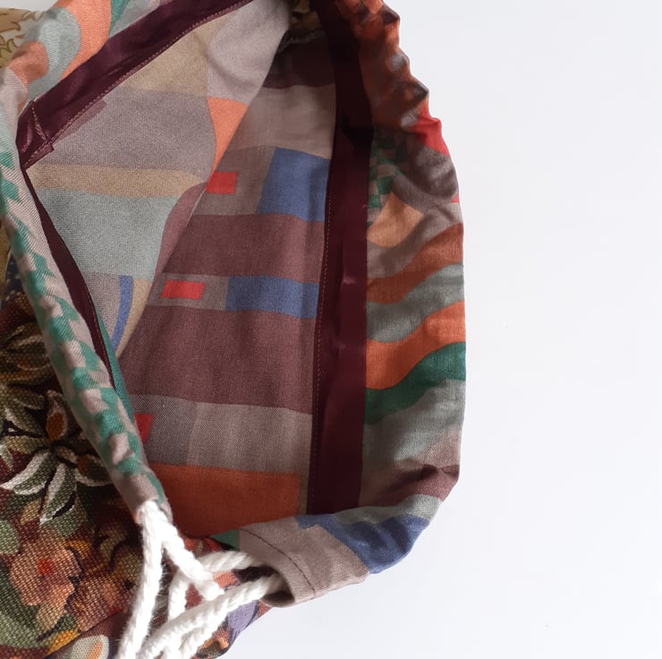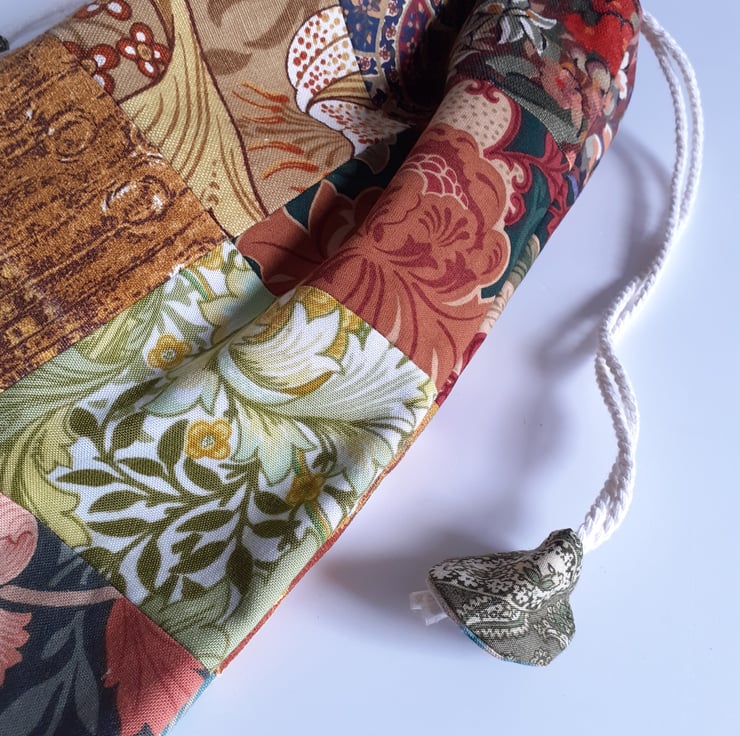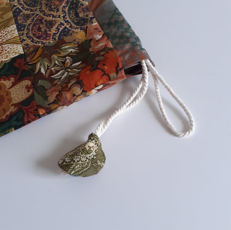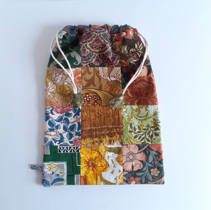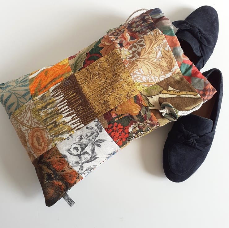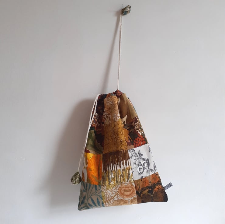 A drawstring bag or shoe bag which has been upcycled from a selection of vintage fabric patchwork squares. These little pieces are from some of the earliest vintage fabric bags I ever made, including some great designers from the 60s and 70s. It would make a great present for a vintage fabrics fan, and there is a matching bucket bag also in my shop right now!