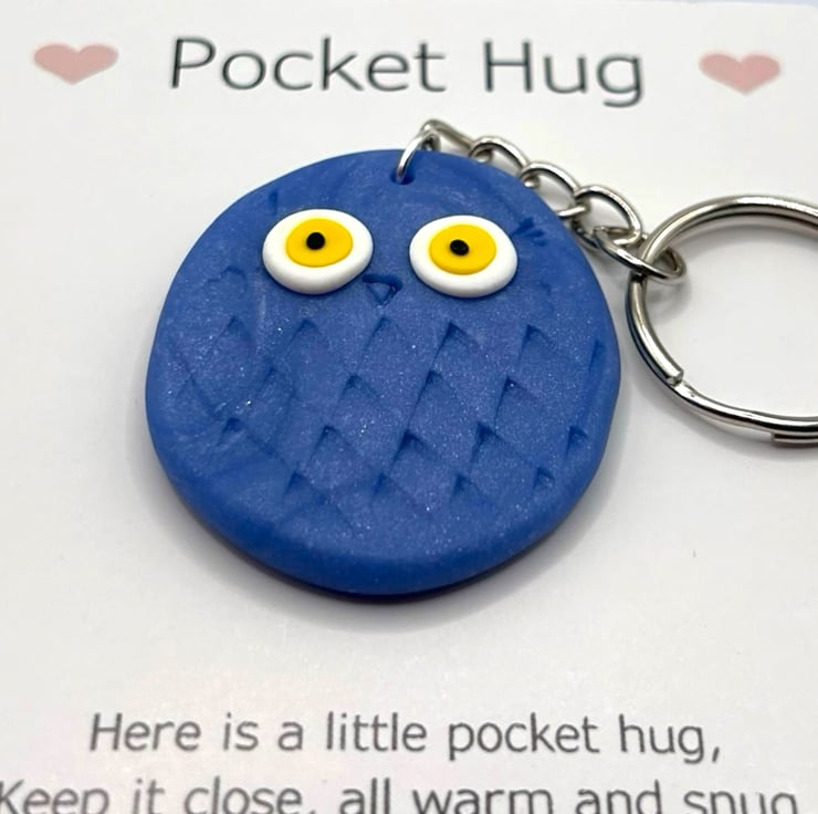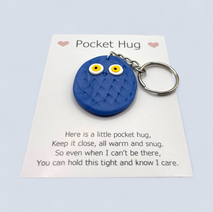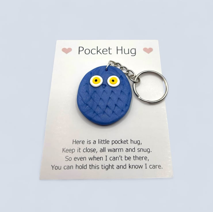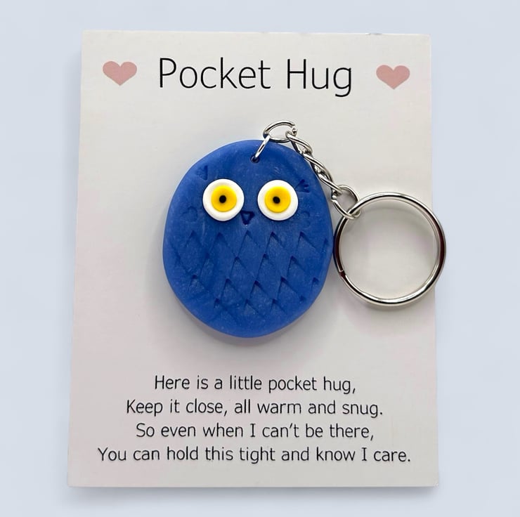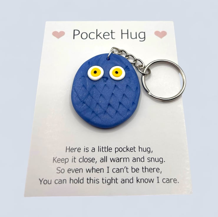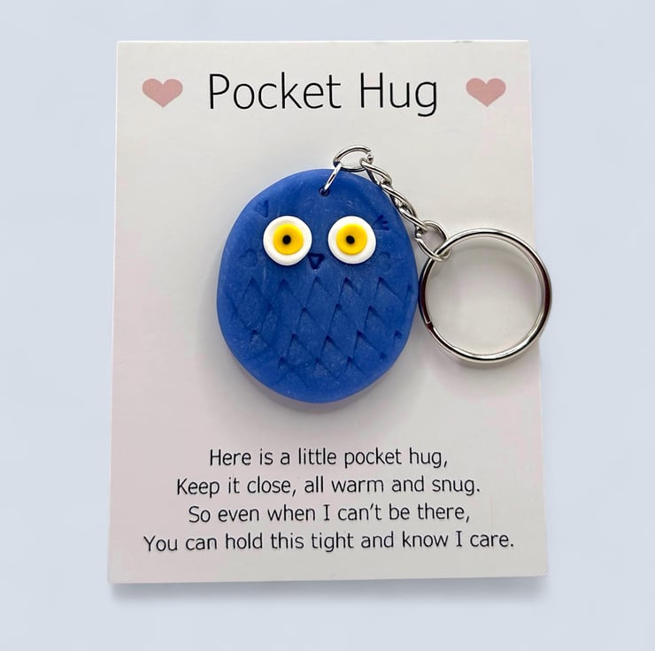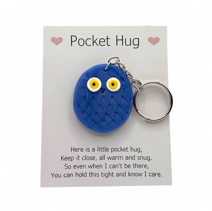 The owl is attached to a card that reads "Pocket Hug" at the top, accompanied by a poem below. It can easily be removed from the card, and the glue dot is simple to peel off. Since each owl is made by hand, no two will be exactly alike, but they will all be irresistibly cute.