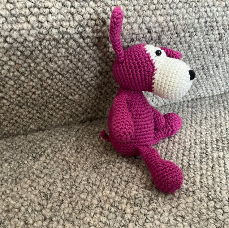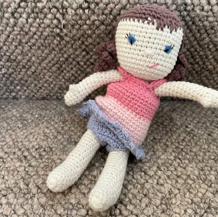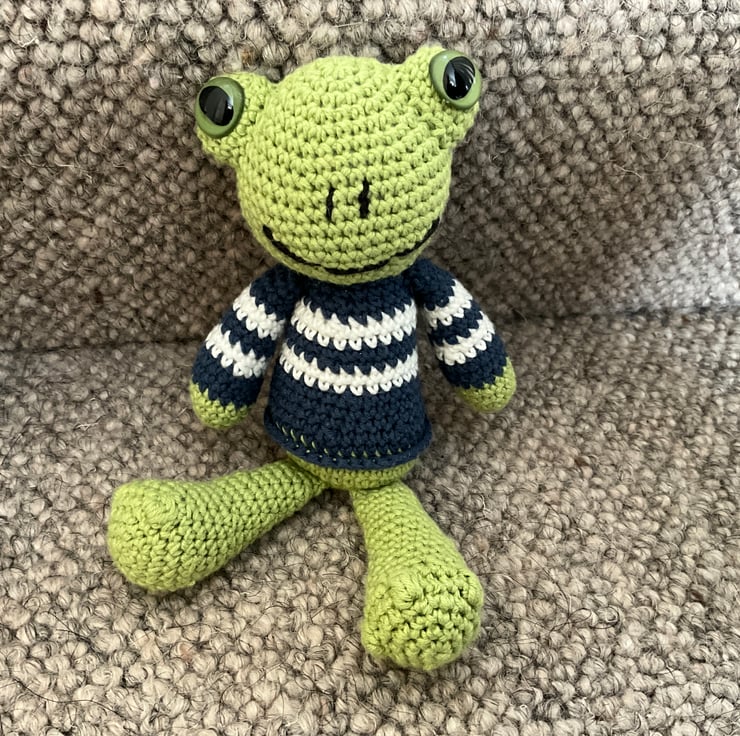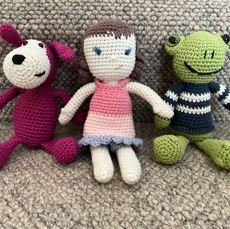 Amigurumi soft toy for 3 years plus (due to small parts posing chocking hazard to babies and very young children) pure cotton washable pal to love. Chose from ‘Paddy the frog’ ‘Rufus hound’ and ‘Molly dress up doll’ They are all approximately 7.5 inches/ 19cms tall. Can be custom made in colours of your choice. Every doll is unique. Price is for one toy.