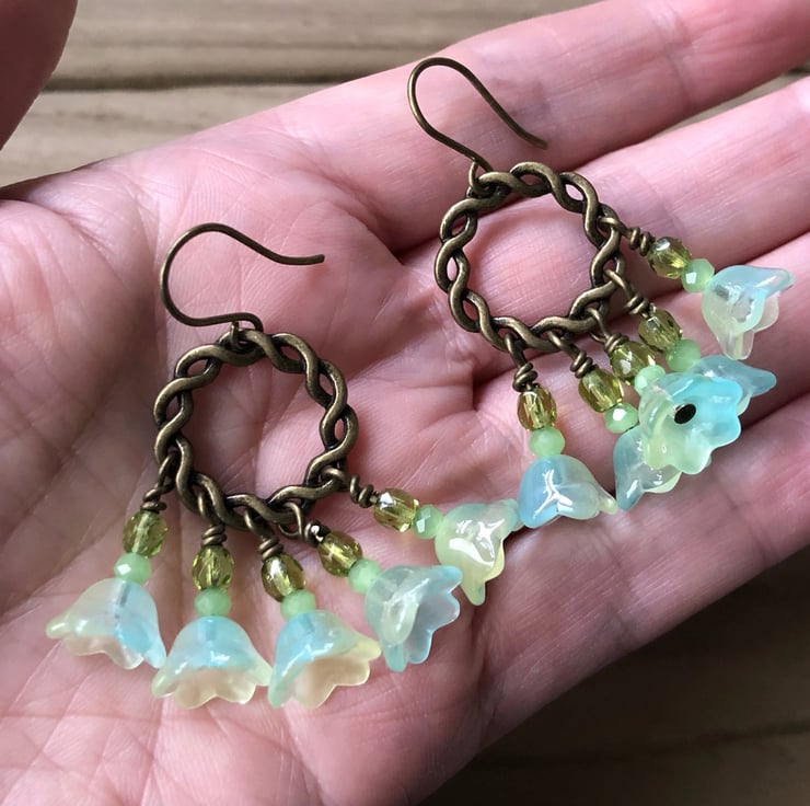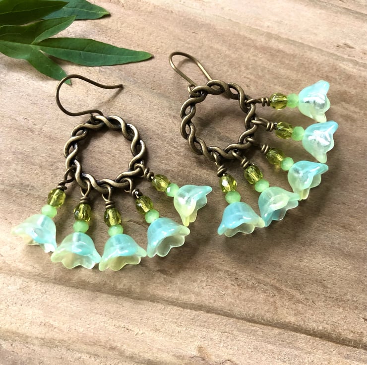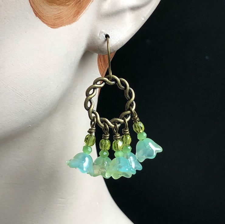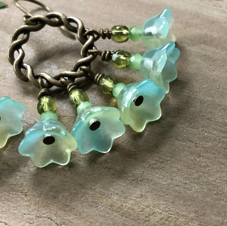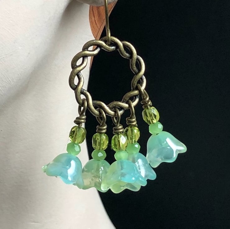 Lovely dangly floral Boho earrings with blue & green glass flowers and green fire polished glass crystal beads suspended on bronze tone twisted wire rings.