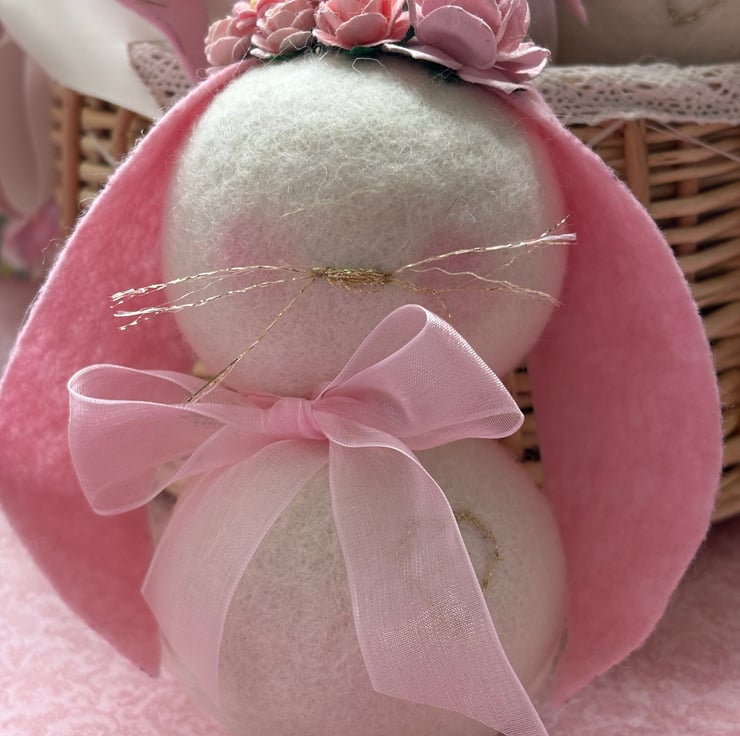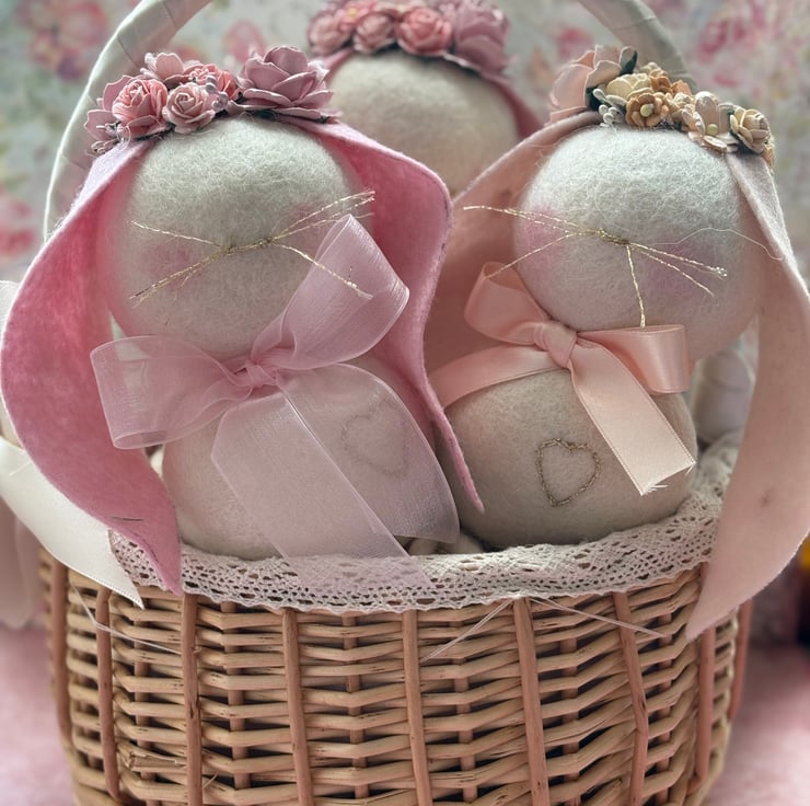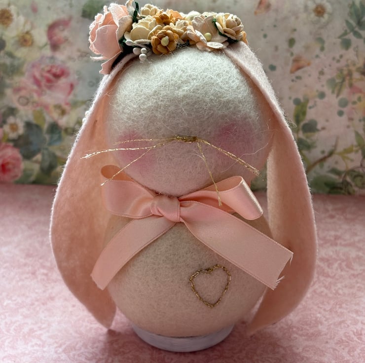 These cute little rabbits are around 15cm /6in tall. They are made using pure wool balls I an ivory shade and wool felt ears I two colour ways peach or pastel pink . I have used gold tread to sew on a nose and whiskers and they also have a gold heart embroidered on the body and a beautiful little flower crown made of mulberry paper flowers. These whimsical bunnies make a lovely easter gift for young an old.