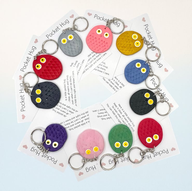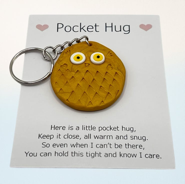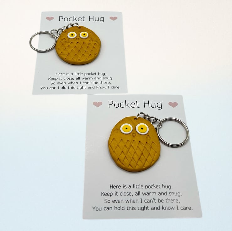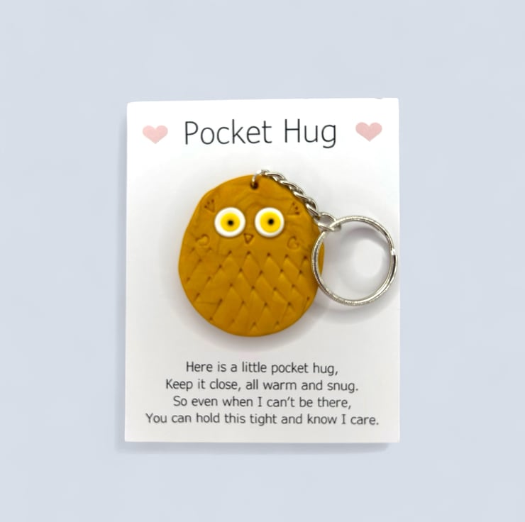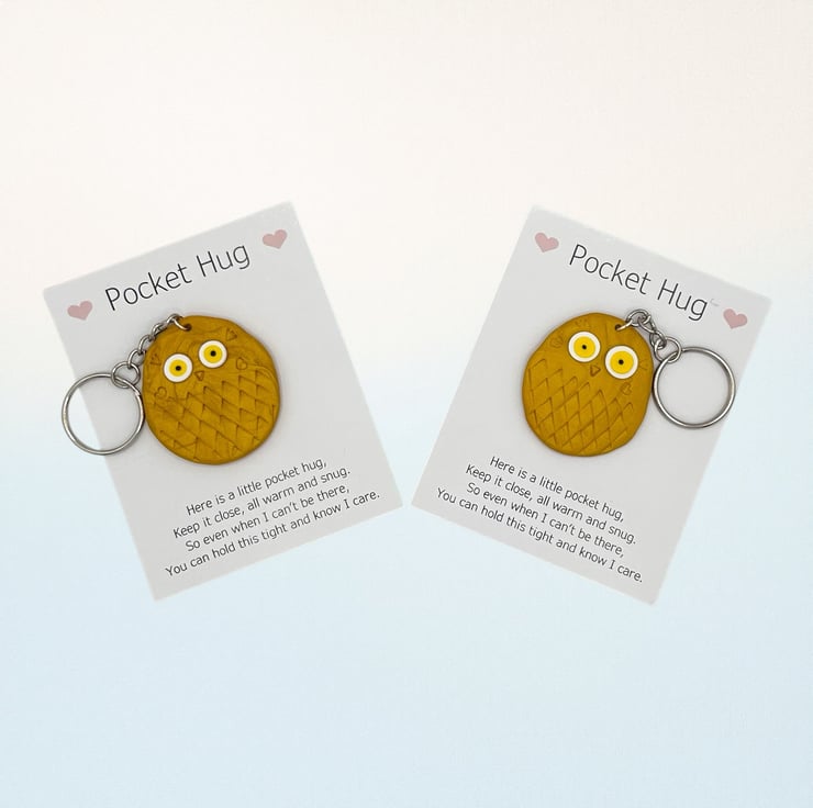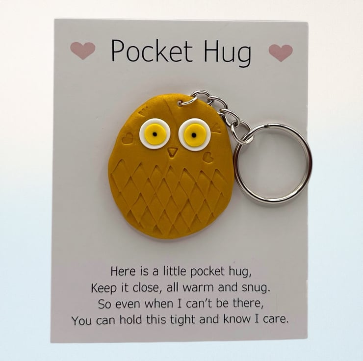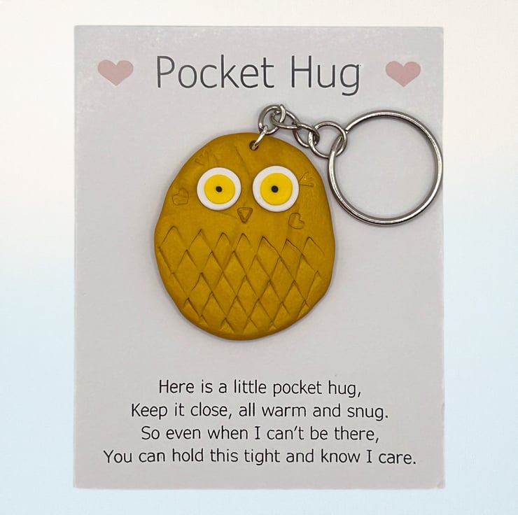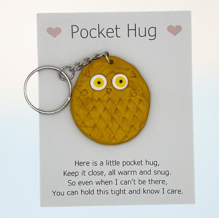 The owl is attached to a card that reads "Pocket Hug" at the top, accompanied by a poem below. It can easily be removed from the card, and the glue dot is simple to peel off. Since each owl is made by hand, no two will be exactly alike, but they will all be irresistibly cute.
