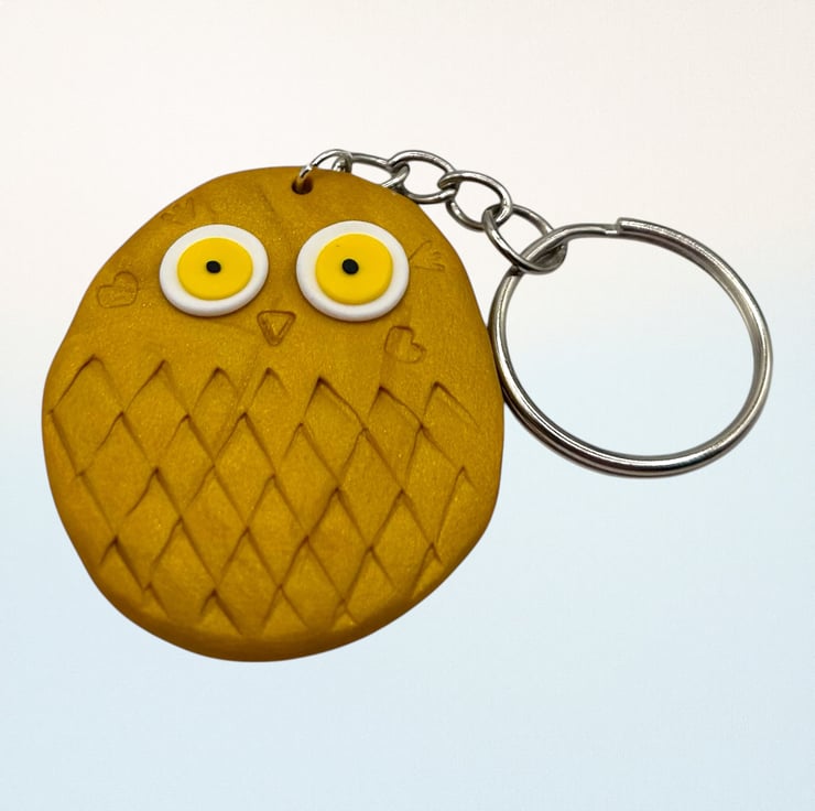 This adorable little golden owl is handcrafted from polymer clay and features my original design. It includes a chain and a sturdy split ring, making it perfect for use as a keychain or a bag charm. It would make a lovely gift for a loved one, friend, or anyone you want to let know you're thinking of them.