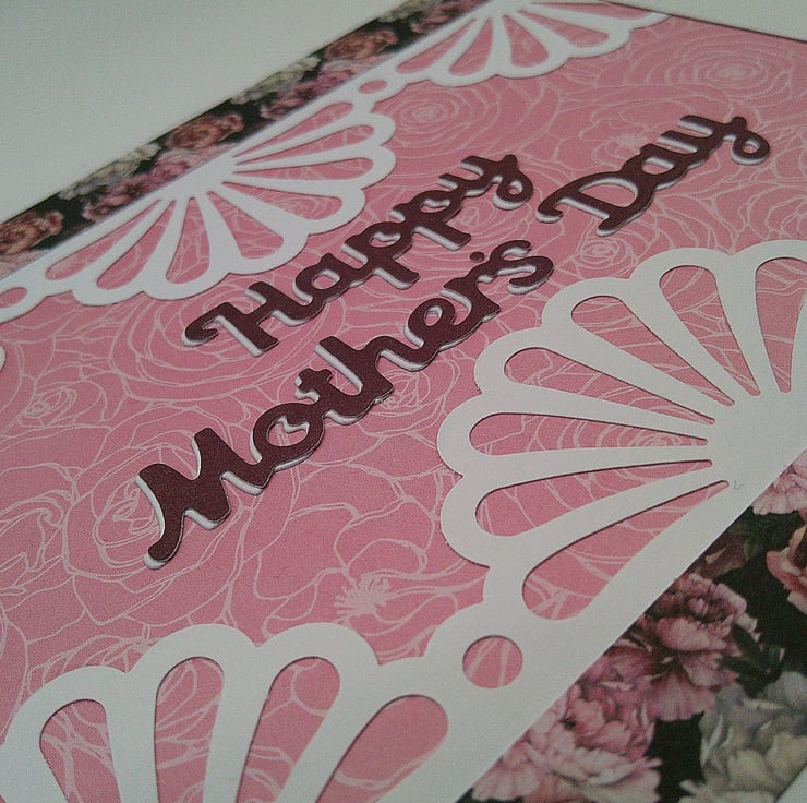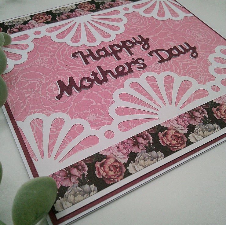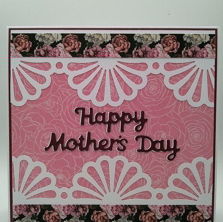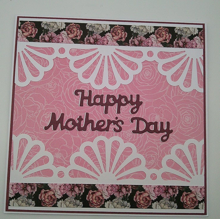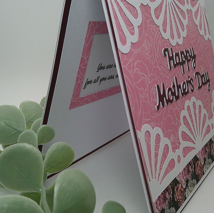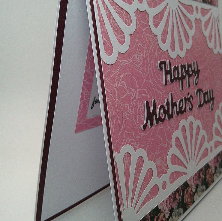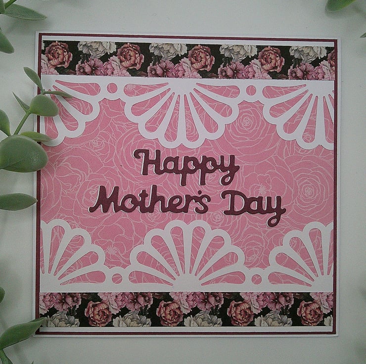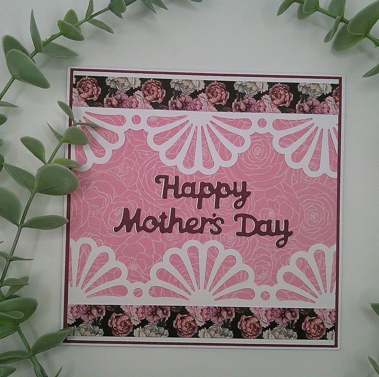 Measuring 5.5 x 5.5 inches, this handcrafted card has been created using complimentary tones of pink, burgundy and floral patterned cards, with white decorative accents.