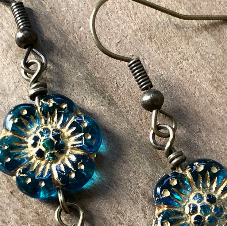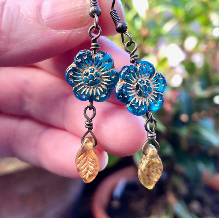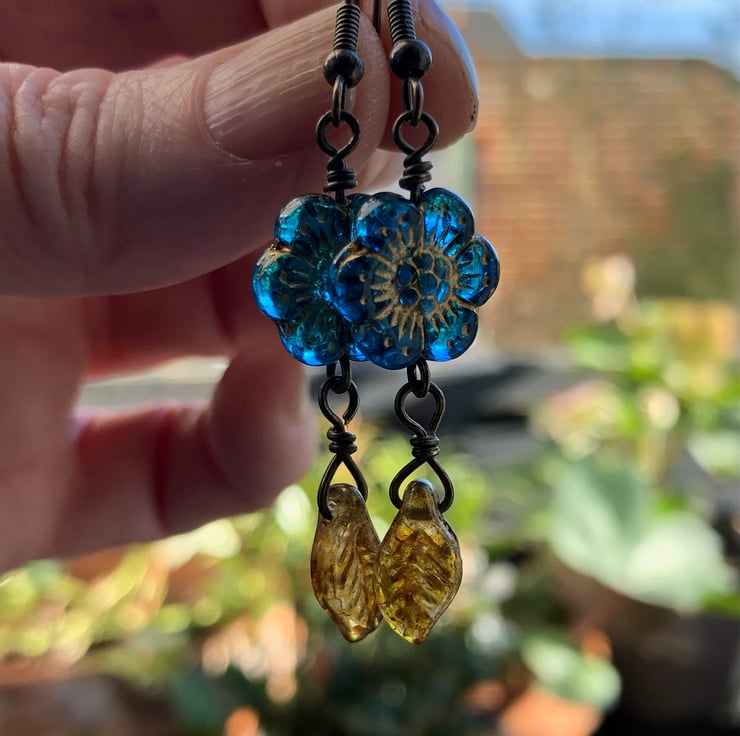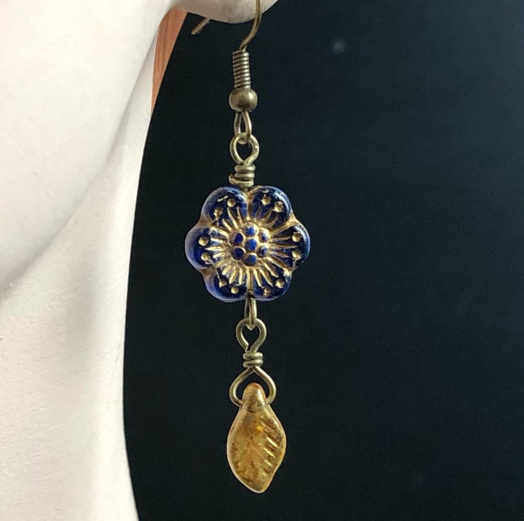Dangly lightweight elegant Boho flower earrings with translucent deep Sapphire blue Czech glass flower beads and gold Czech glass leaf drops.