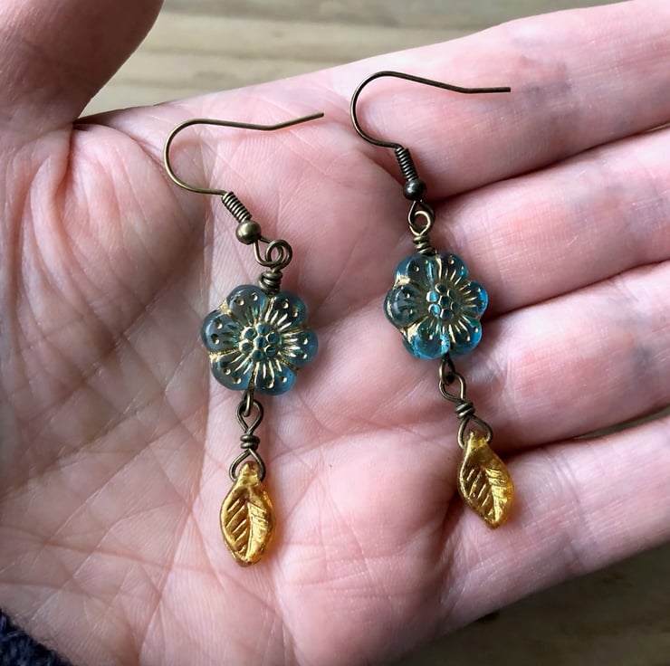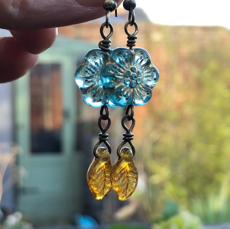 Lovely dangly elegant Bohemina flower earrings with translucent sky blue Czech glass flower beads and gold Czech glass leaf drops.