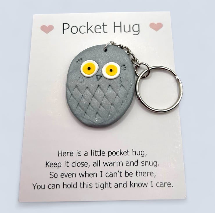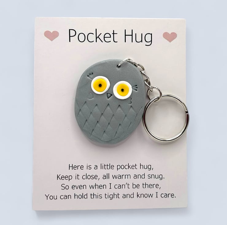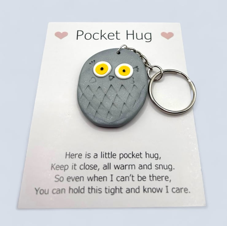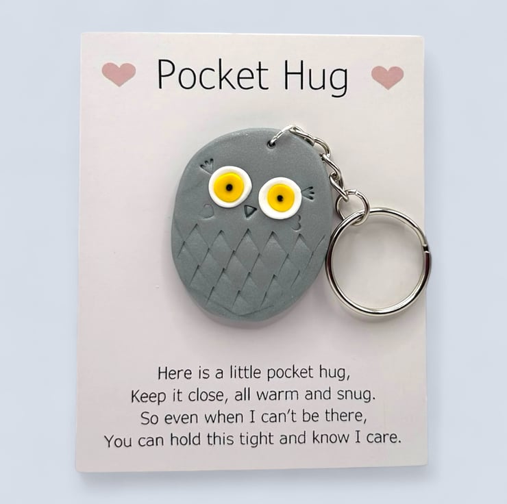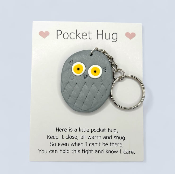 The owl is attached to a card that reads "Pocket Hug" at the top, accompanied by a poem below. It can easily be removed from the card, and the glue dot is simple to peel off. Since each owl is made by hand, no two will be exactly alike, but they will all be irresistibly cute.