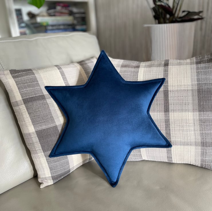 Discover the beauty and significance of Star of David-shaped cushion, a perfect blend of tradition and elegance. Whether you're celebrating Hanukkah, honoring a Jewish holiday, or simply adding a meaningful touch to a child’s room, this navy blue star pillow is designed to bring warmth and charm to any occasion.