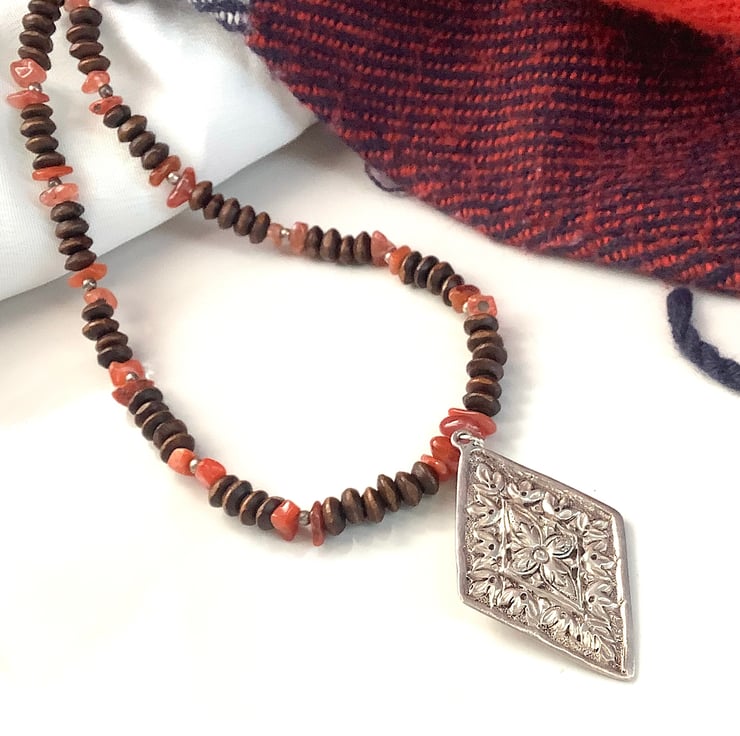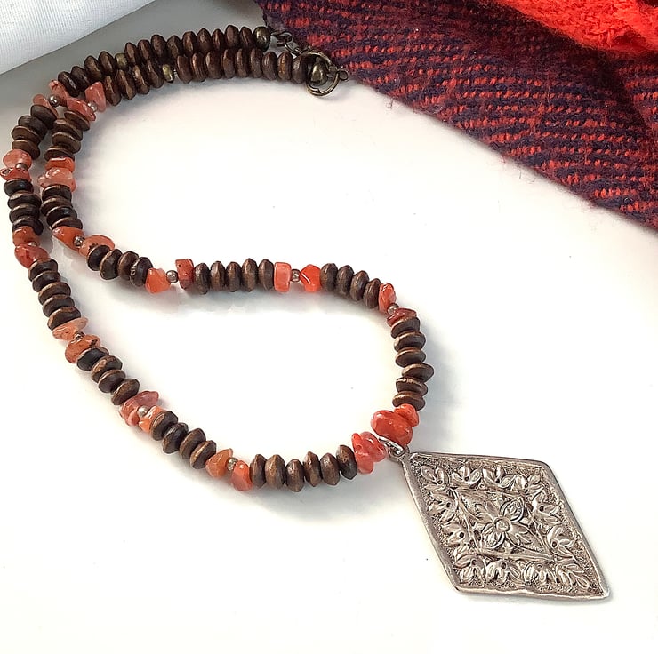 Carnelian and wooden beads necklace with up cycled vintage silver pendant (I have tested it). Length: 42 cm, pendant 5 cm. Brass effect hook fasting