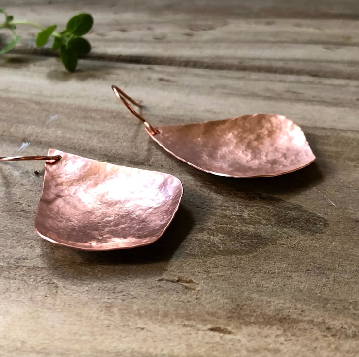 I have cut and hammered the earrings into a large bowed teardrop shape.
