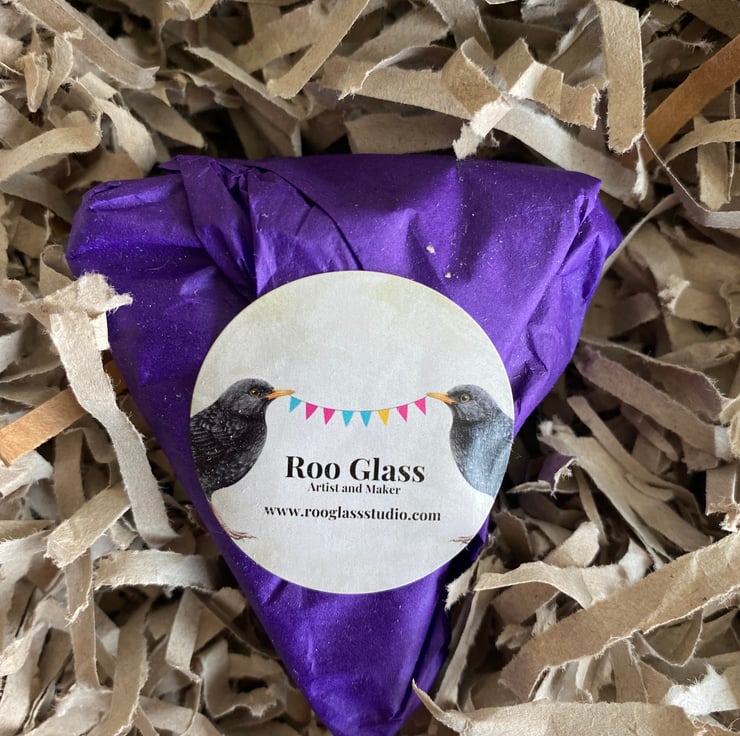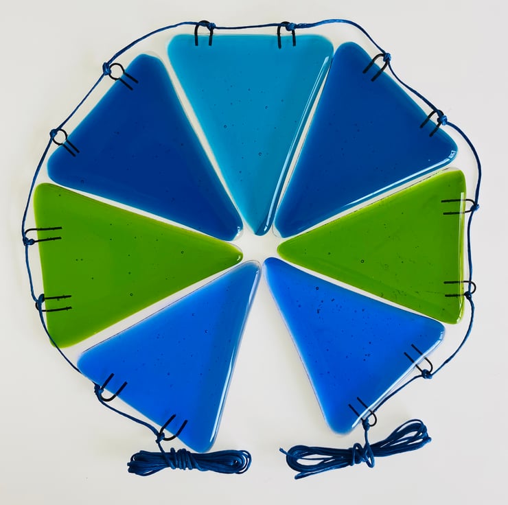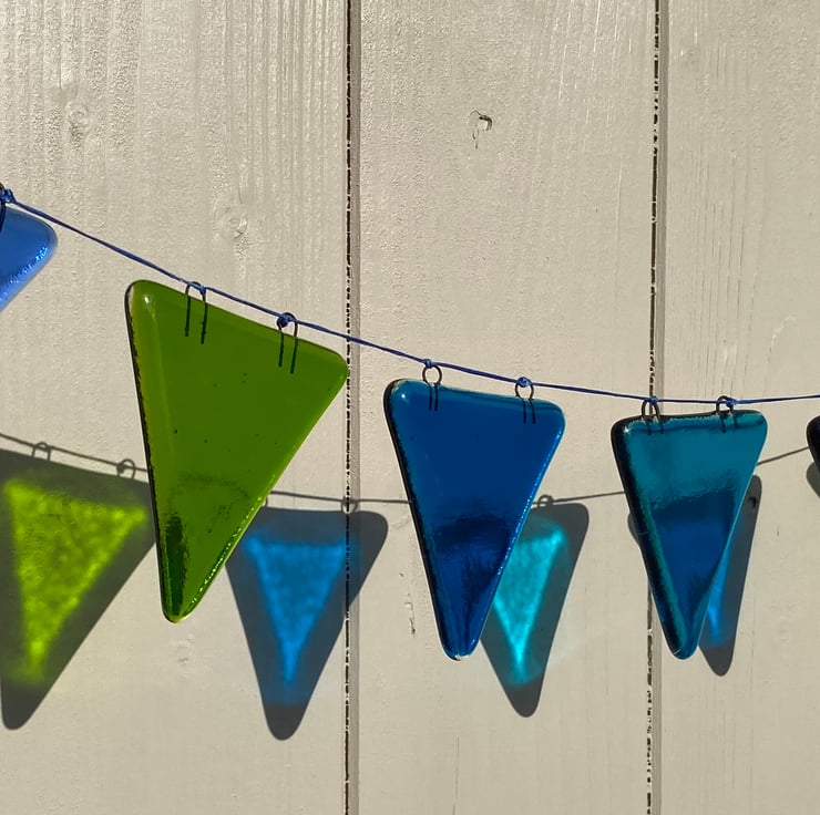This colourful Blue/Green glass bunting is hand cut and then fused in the kiln at my small Yorkshire studio. It looks great hung in a window, in a conservatory, over a fire place, under shelves or against a neutral pattern wall. Colours will look different a different times of the day as the light changes.
