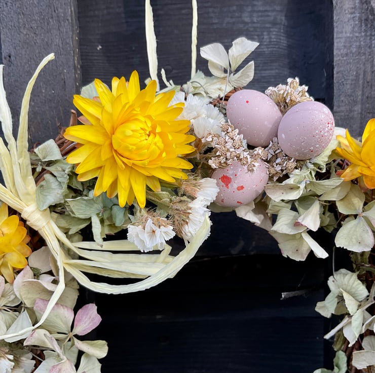 The “Spring Sunshine” wreath is approx. 23cm in diameter and has dried Helichrysums, Hydrangea and Statice with clusters of imitation eggs arranged on a grapevine wreath base. Perfect to gift someone special and brighten an indoor space in Springtime! All my wreaths are a little different. If you order this then the one photographed is the item I shall send to you.