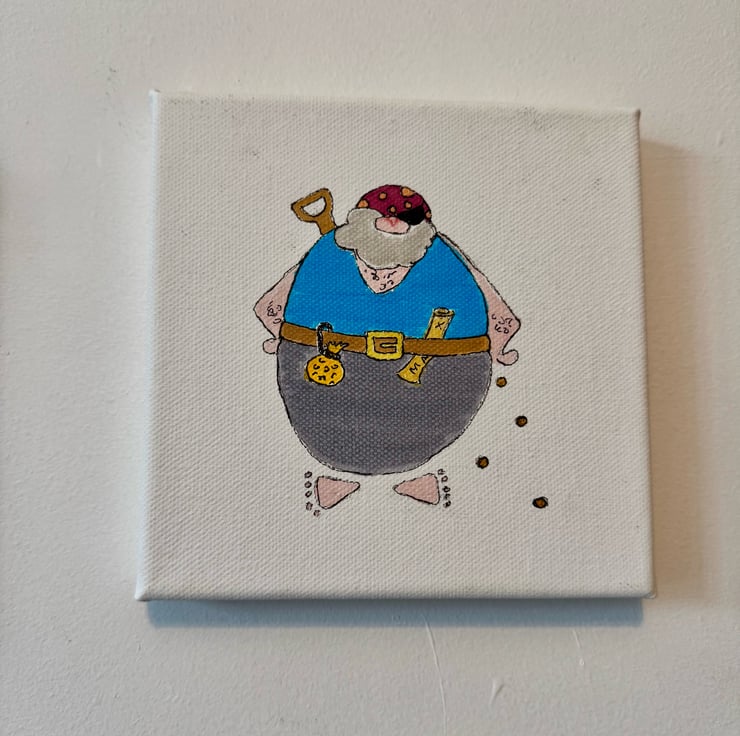 This picture of a Pirate who has just found some treasure has been drawn onto a 15x15cm canvas and coloured using brightly coloured Arteza pens.