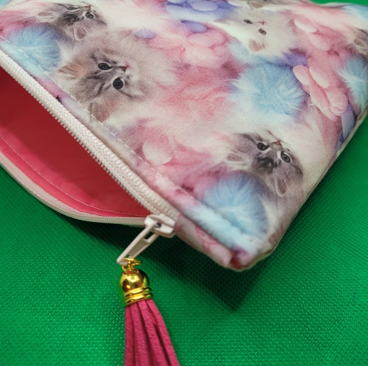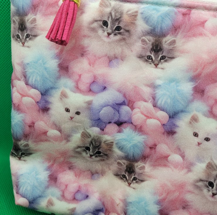 It comes in a gorgeous kittens design cotton fabric with matching pink zip and faux leather zip pull and has a water resistant lining in pink ripstop. The bottom corners are boxed to give a flat bottom and extra space.