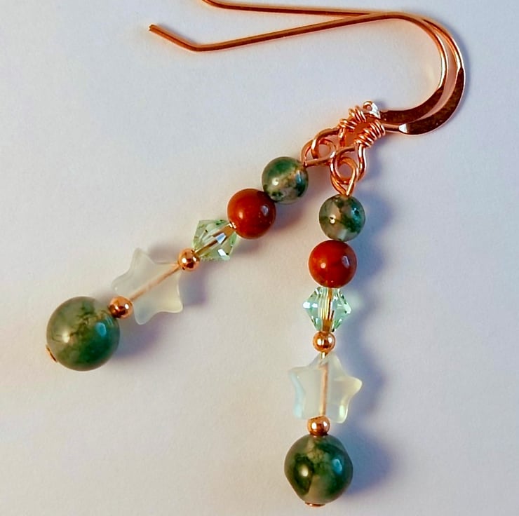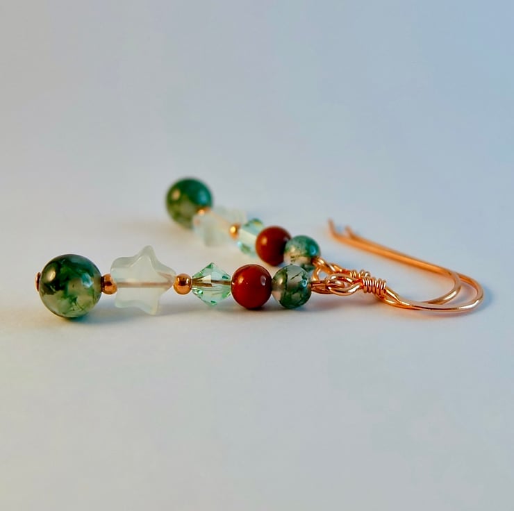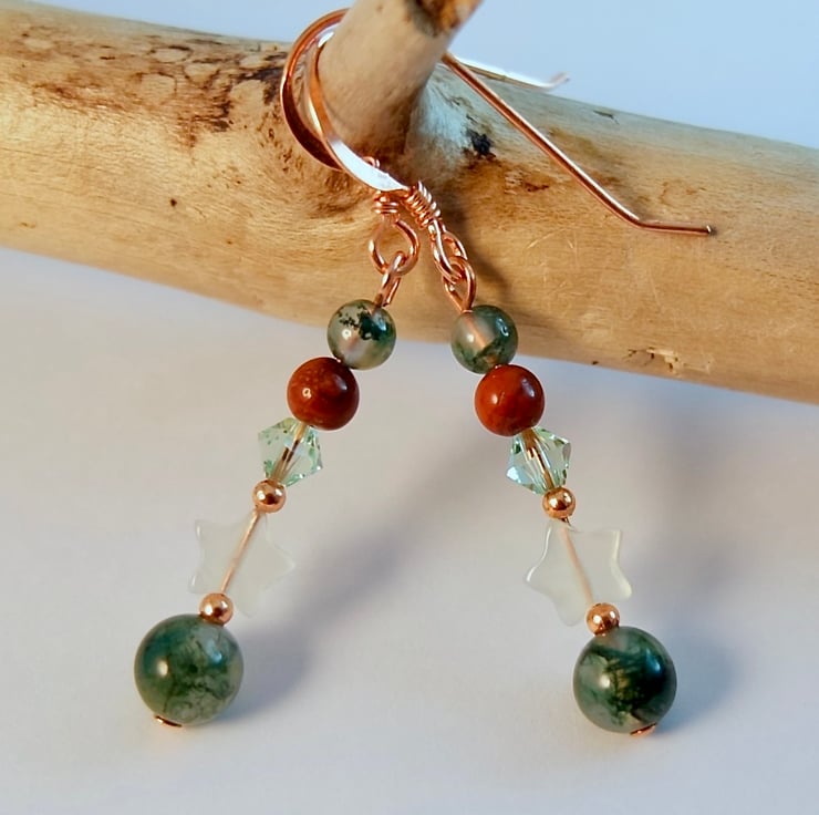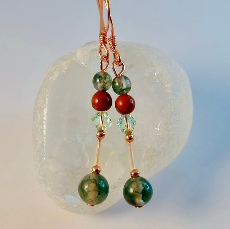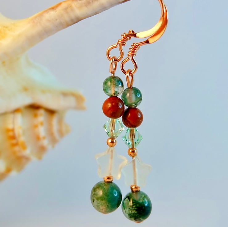 Each drop earring features a 6mm Moss Agate bead, a 6mm Jade star, a sparkly quality Austrian crystal in the colour 'chrysolite' and 4mm beads of red jasper and moss agate.