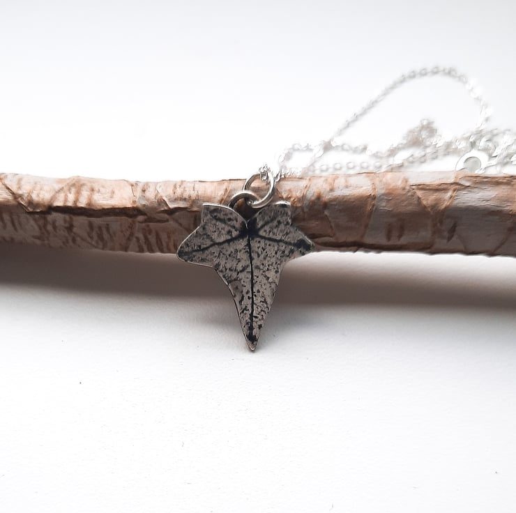 The ivy leaf is made from art silver clay, which once fired, is 99.9% pure silver and 100% recycled silver. It has been oxidised which highlights the vein detail on the leaf.
