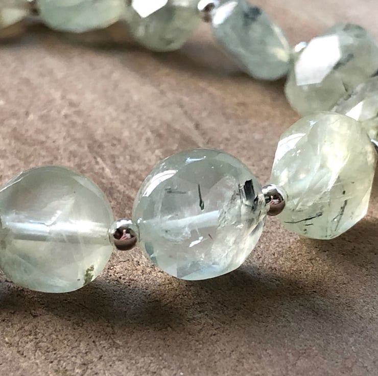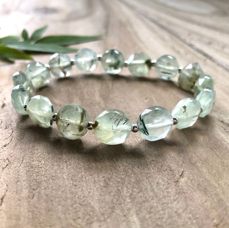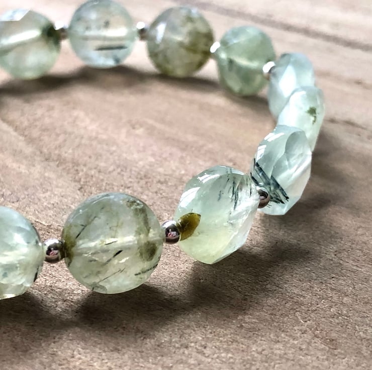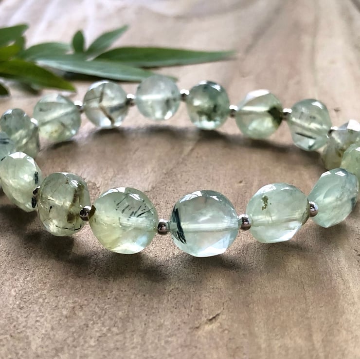 A beautiful gemstone and sterling silver beaded bracelet with gorgeous AAA quality 10mm pale green sparkly faceted Prehnite gemstone coin beads, that have natural little dark inclusions, and 4mm Sterling Silver rondelle beads.