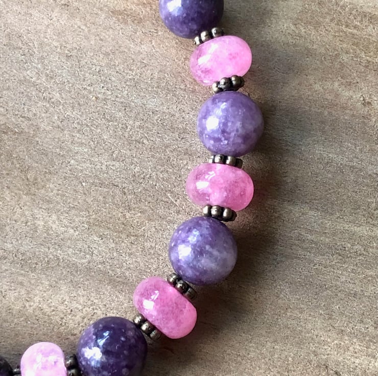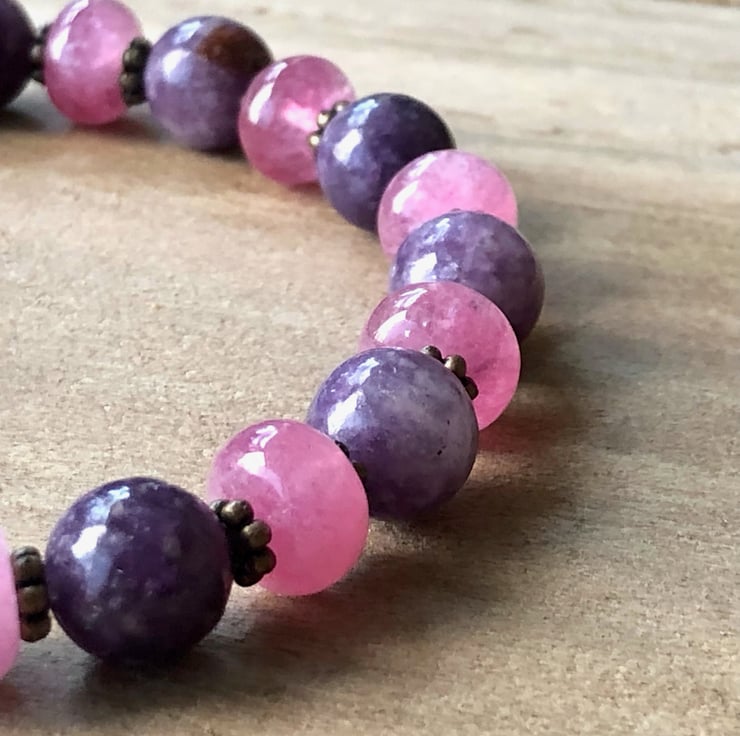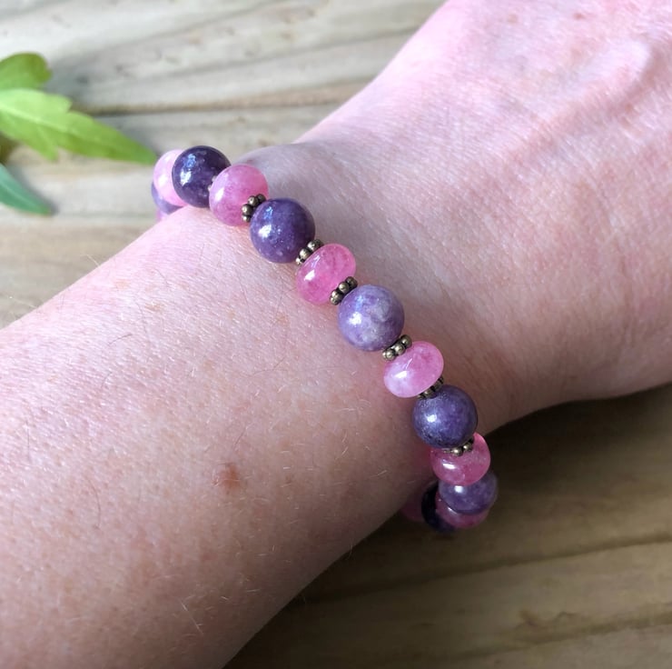 A pink & purple gemstone beaded stretch bracelet with beautiful 8mm translucent pink Tourmaline beads and 8mm purple Jade beads, interspersed with 4mm bronze spacer beads.