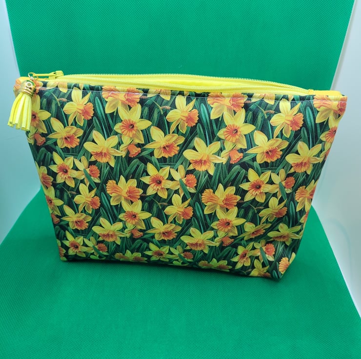 It comes in a cheerful daffodil print cotton fabric with matching zip and faux leather zip pull and has a water resistant lining in yellow ripstop. The bottom corners are boxed to give a flat bottom and extra space.