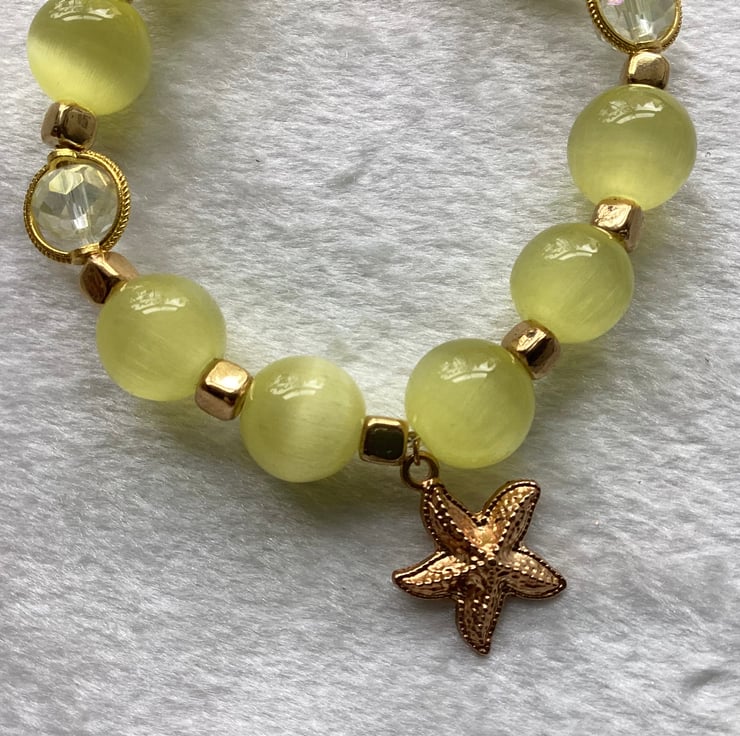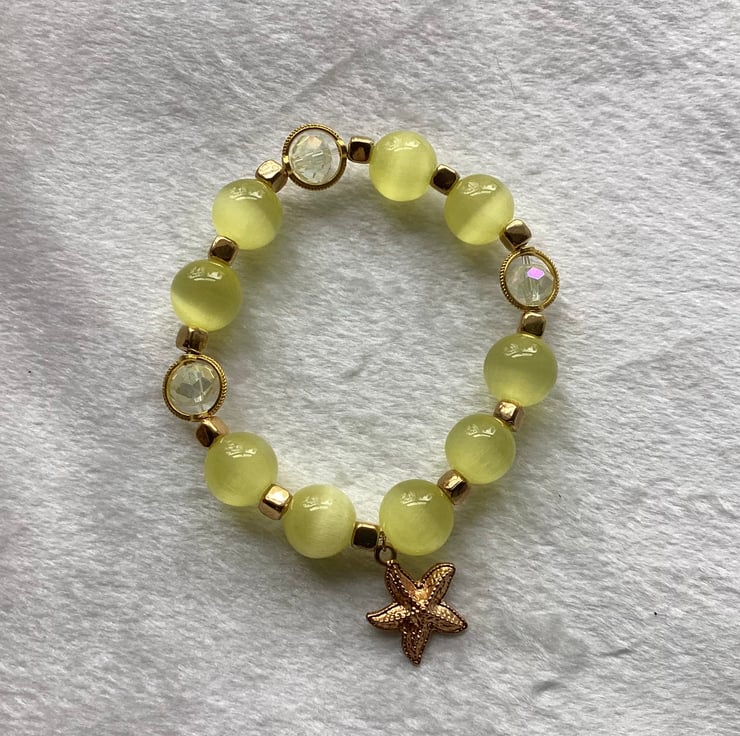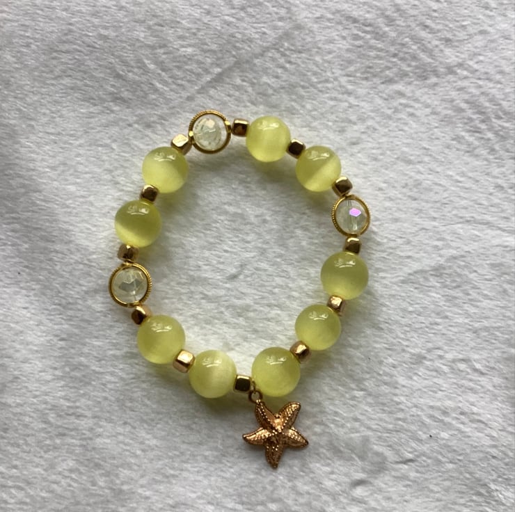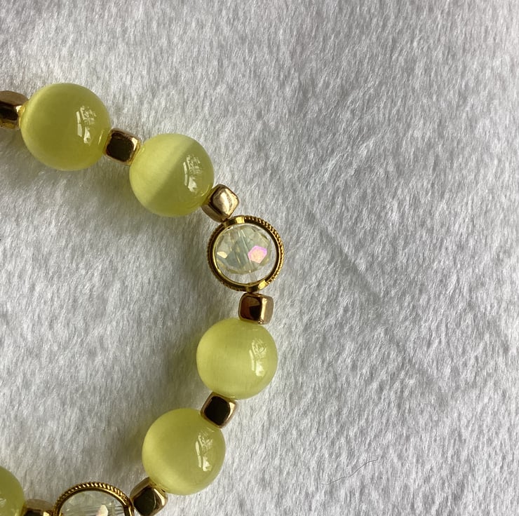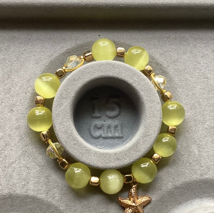 This bracelet made by me in my home studio in West Midlands. Bright, easy to use and eye catching accessories. I’ve used Cats Eye Beads and Glass Czech Beads. Stretch Magic 0.7mm Bead and Jewellery Cord Been double wrap for better strength. Please note: Colours may vary due to different viewing platforms and devices. Measurement in cm.