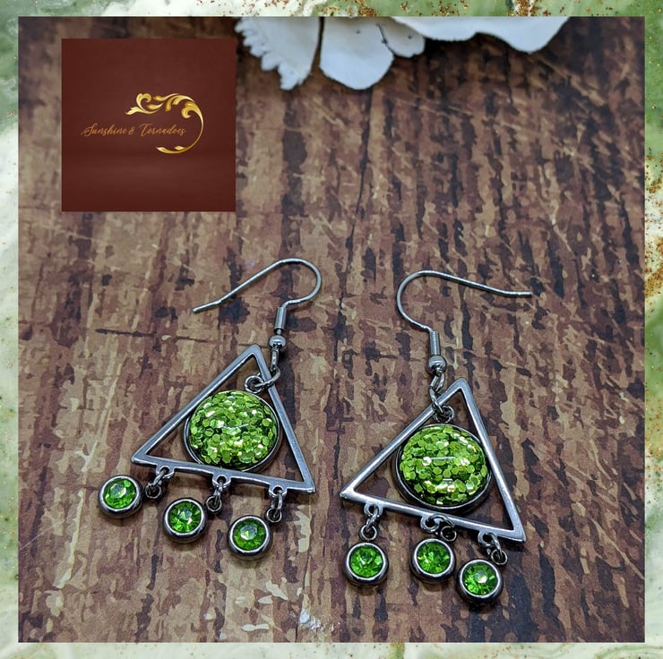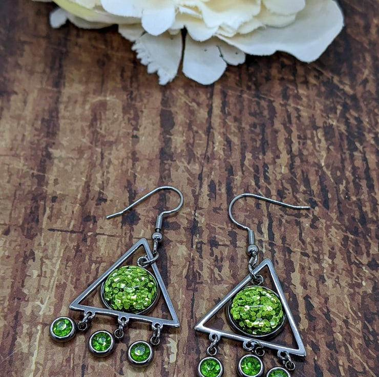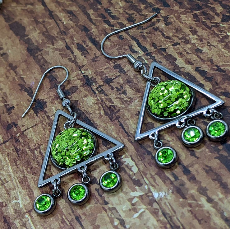 These unusual drop earrings have been made using hand poured, ink-dyed glitter infused resin.