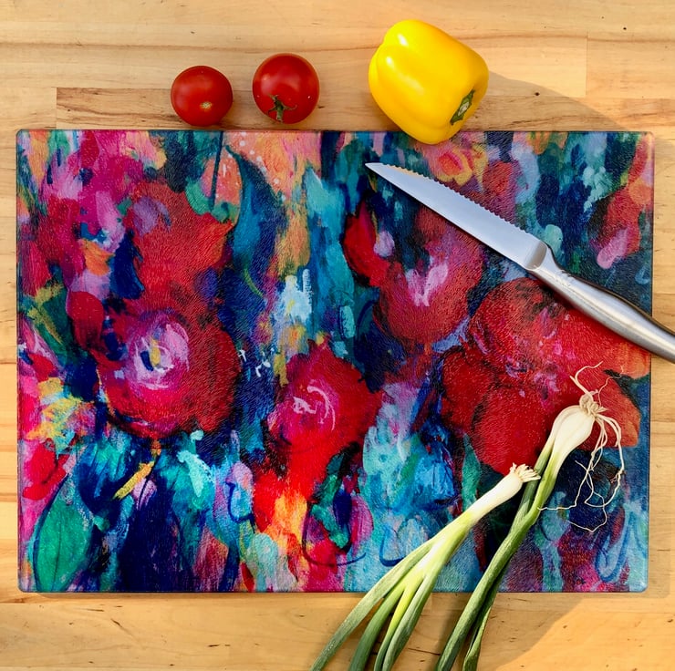 Add a splash of colour to your kitchen with this unique chopping board featuring the joyful, floral design 'Carnival' taken from one of my original paintings.