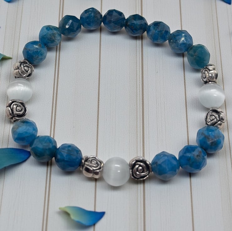 1. Dive into the serene beauty of the ocean with this stunning handmade stretch bracelet, featuring top Grade 8mm Faceted Blue Apatite and delicate 8mm selenite beads, accented with Tibetan Silver rose spacers. This elasticated bracelet comfortably fits wrists from 7” to 8”, making it a versatile accessory for any occasion. Not only does it look gorgeous, but the Apatite is also believed to inspire personal growth and enhance intuition, helping you express yourself with clarity and creativity. Each bracelet comes beautifully wrapped in tissue and a charming organza bag, ready for gifting or a special treat for yourself. Plus, enjoy peace of mind with 48-hour tracked postage!