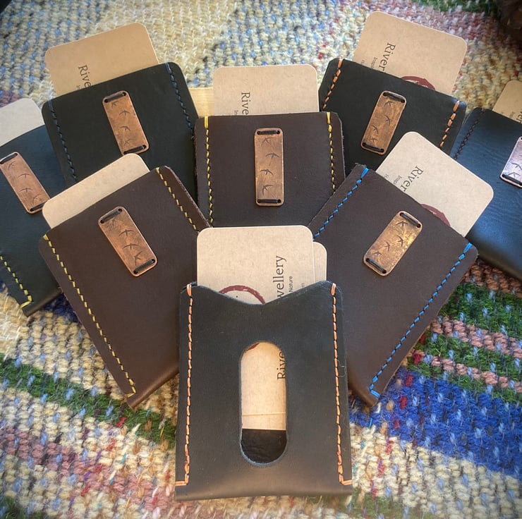 Hand-Sewn Leather Card Wallet with acid etched copper Swirling Swifts design