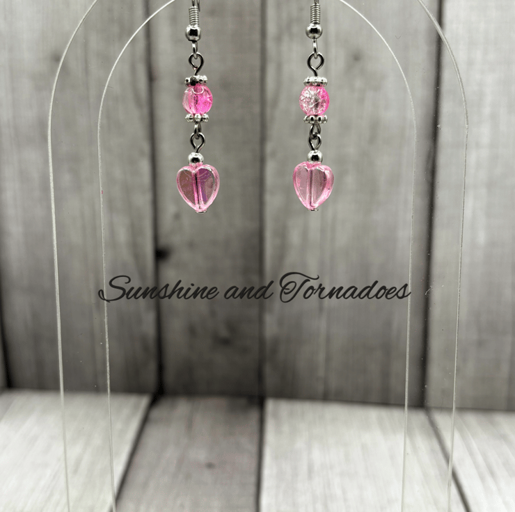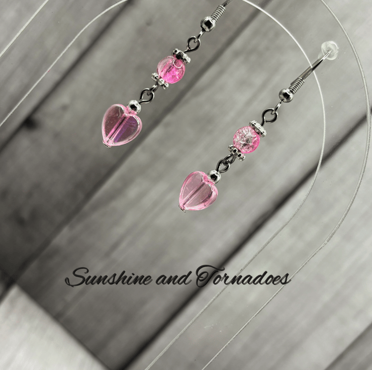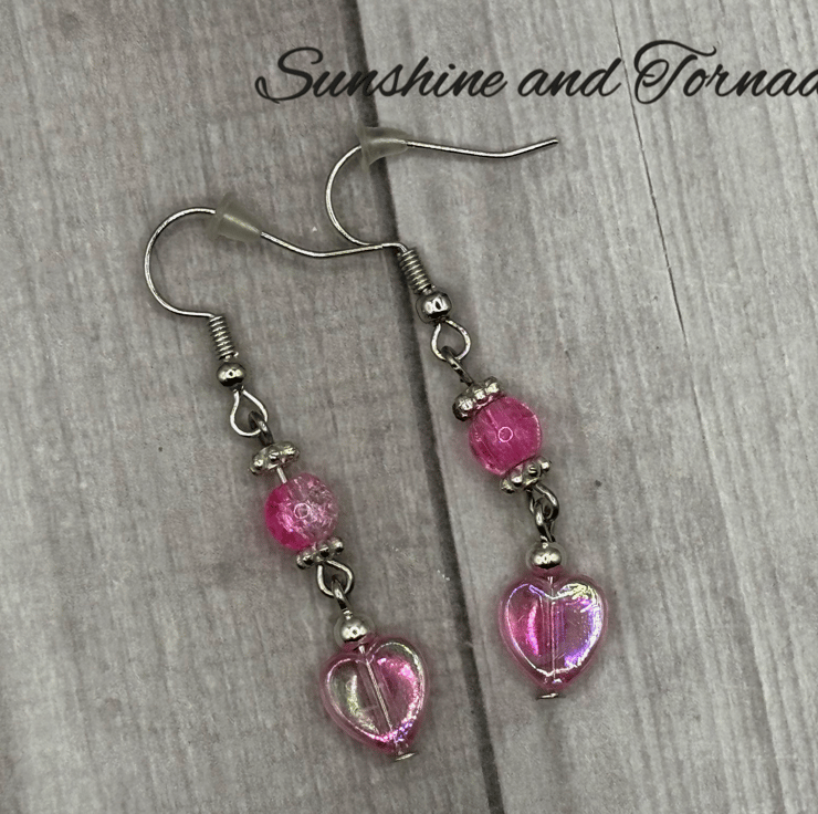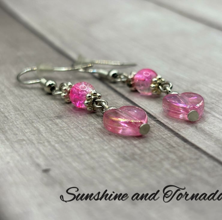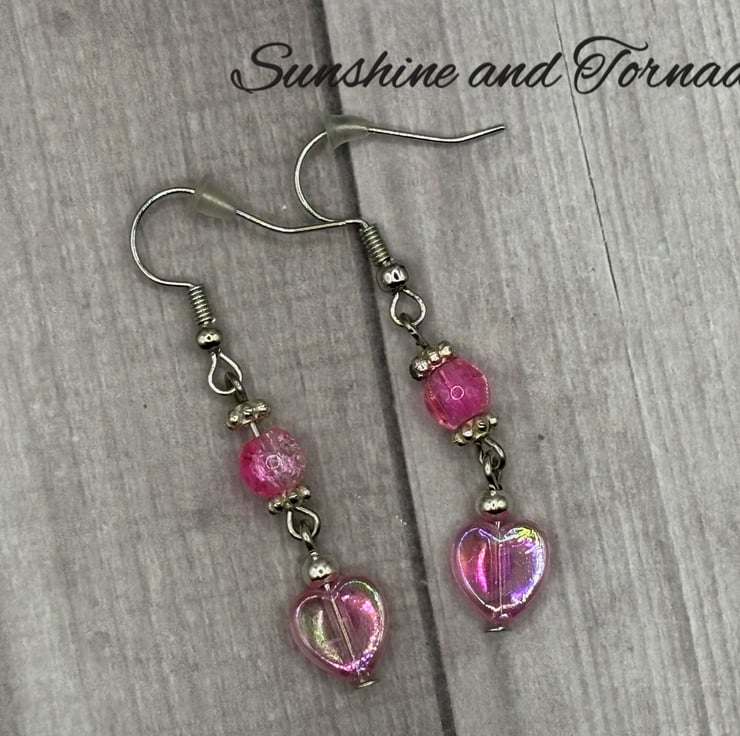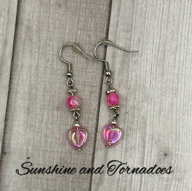 These sweet drop earrings have been handmade using 6mm Heart Shaped beads, and 4mm round beads, both of which have a beautiful AB coating, which makes them sparkle in the light.