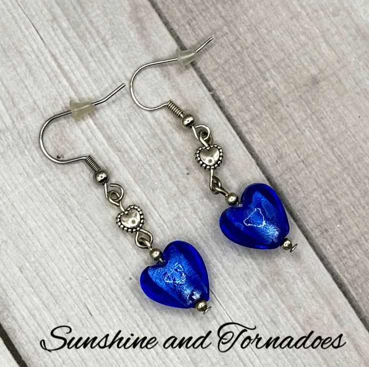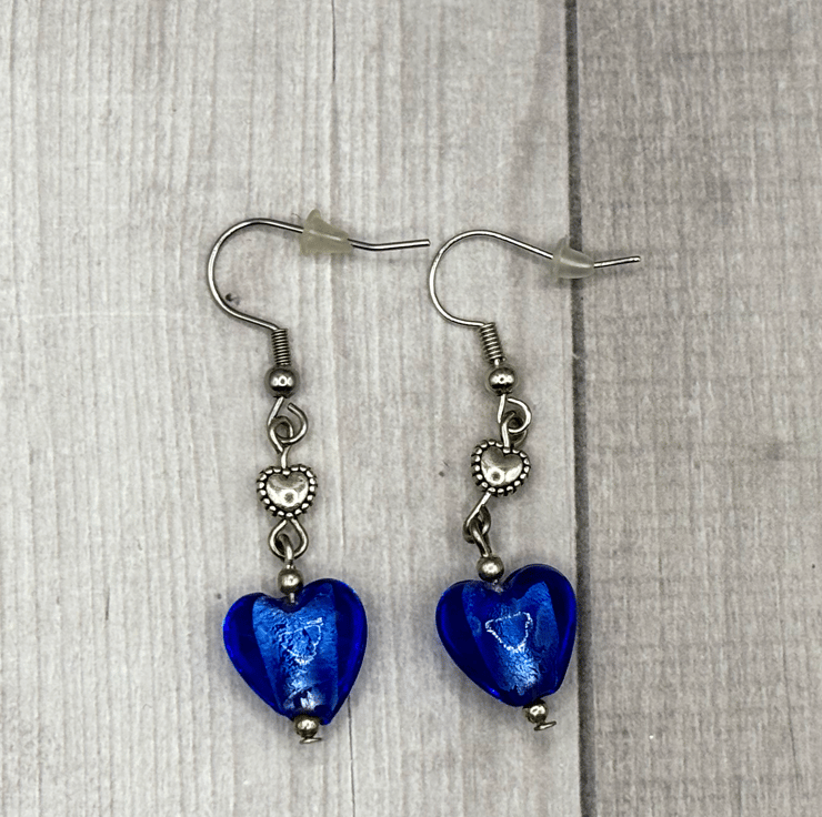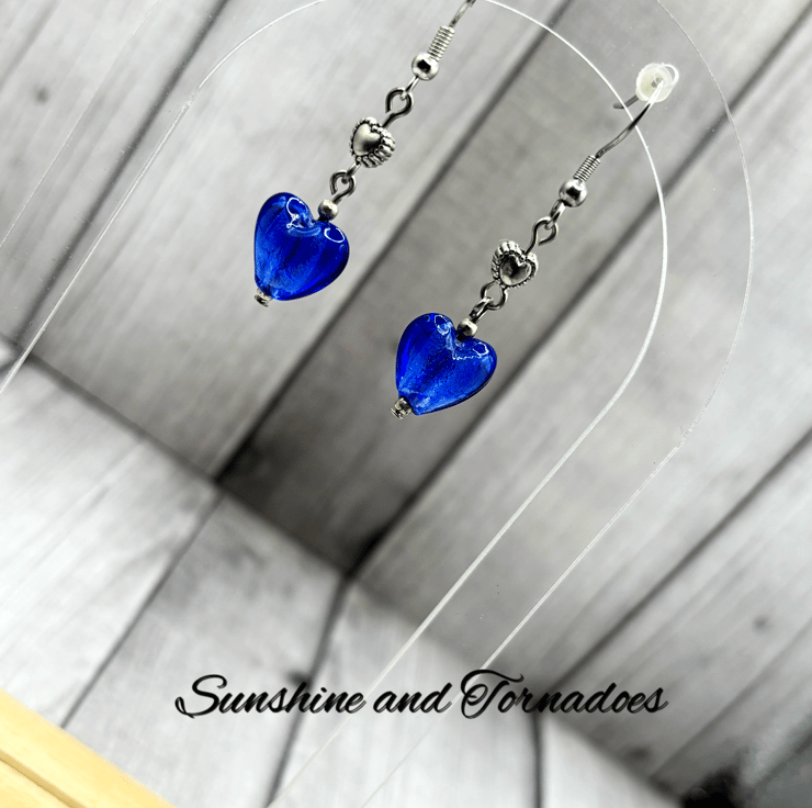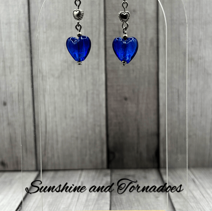 These one of a kind earrings have been handmade using handmade lampwork glass heart beads in a beautiful deep blue colour, with tiny tibetan silver heart shaped spacer beads and silver plated ball spacers.