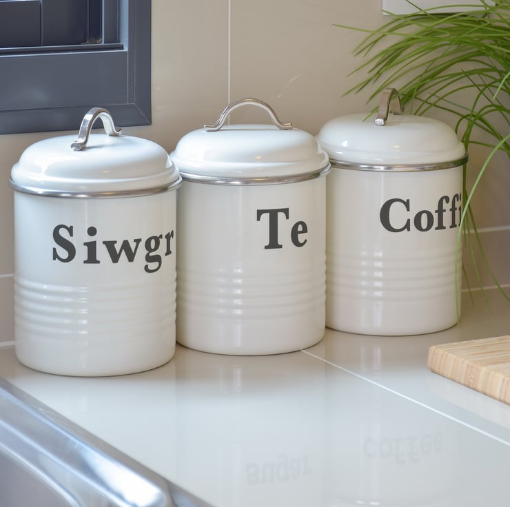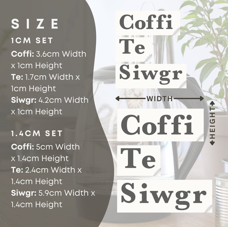 Add a timeless and sophisticated touch to your kitchen with these Welsh language canister stickers. Designed with a classic serif font, these labels bring a refined and traditional look to your tea, coffee, and sugar jars. Available in two size sets, they fit a variety of jar styles. Made from high-quality waterproof vinyl, these stickers are durable, long-lasting, and easy to apply.
