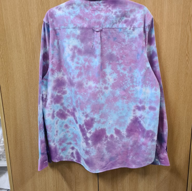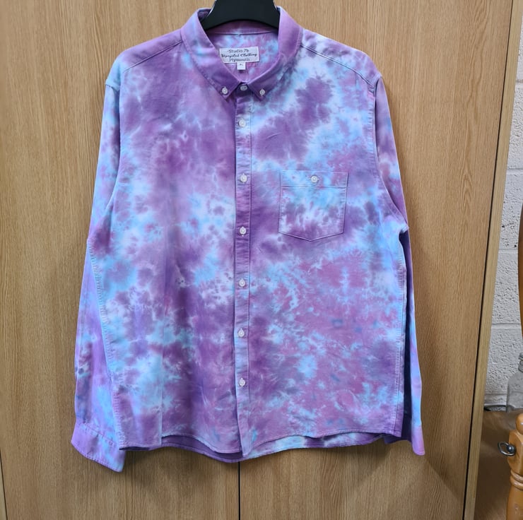 An Oxford shirt tie dyed in shades of blue and purple. Size XL.