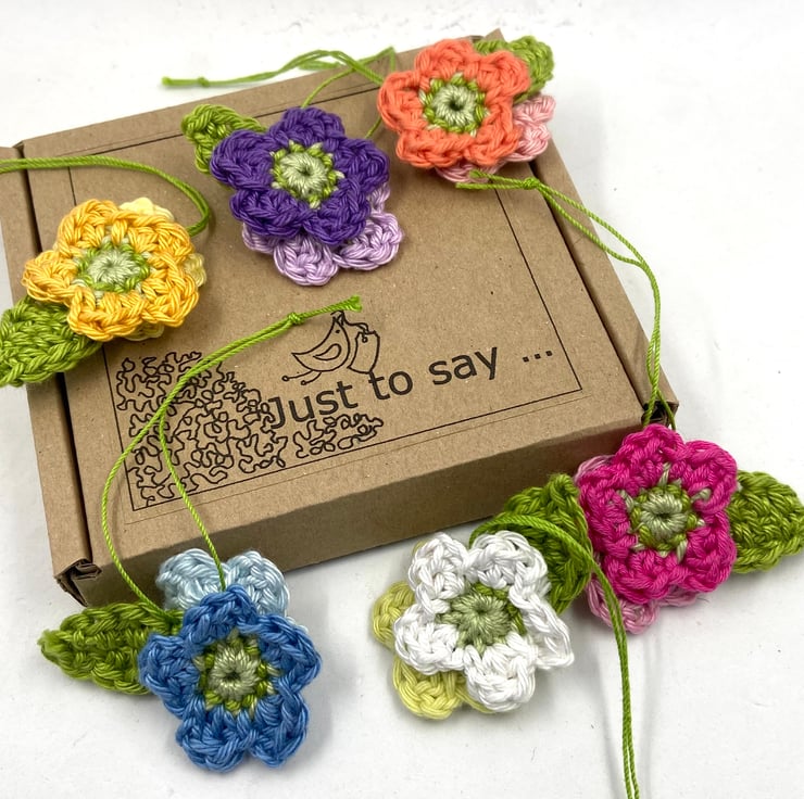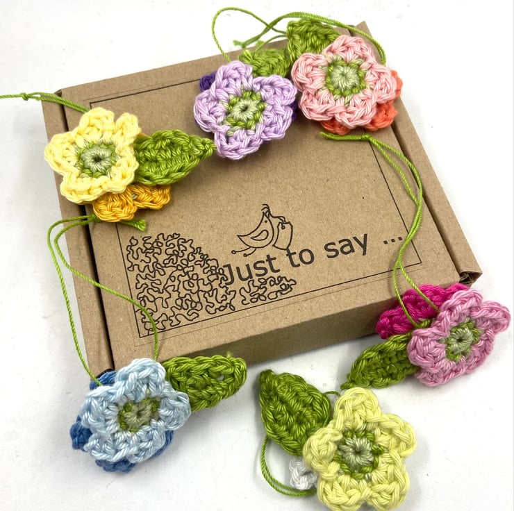 These pretty flowers are crocheted in cotton in 12 spring shades. They are perfect for attaching to a gift or for hanging on an Easter branch. They hang from storing but fine crochet thread and a tag with wording of your choice can be added to the box if you are gifting this set.