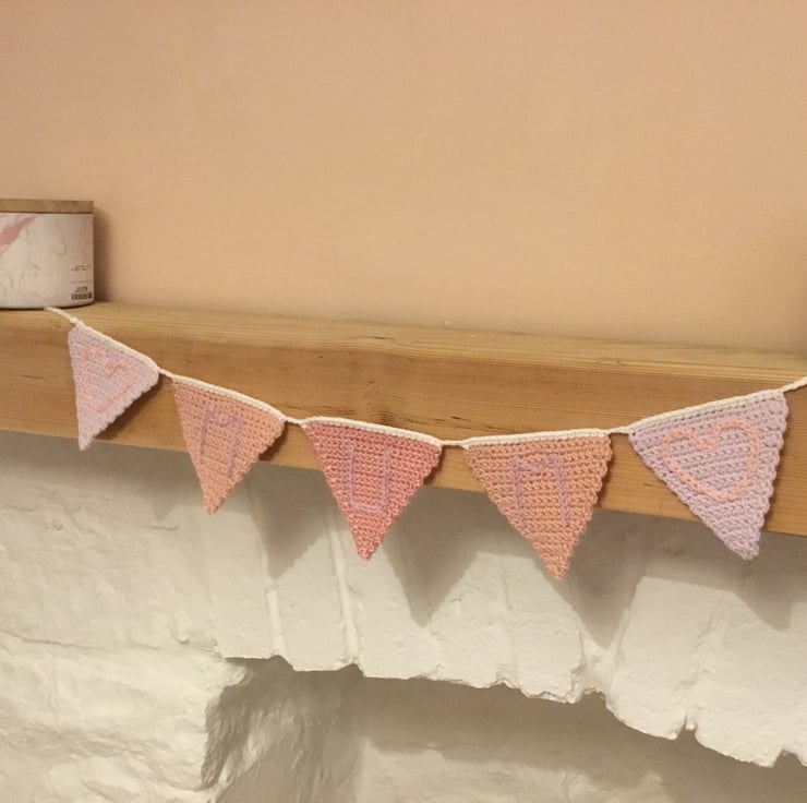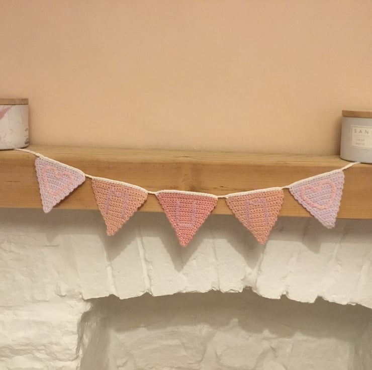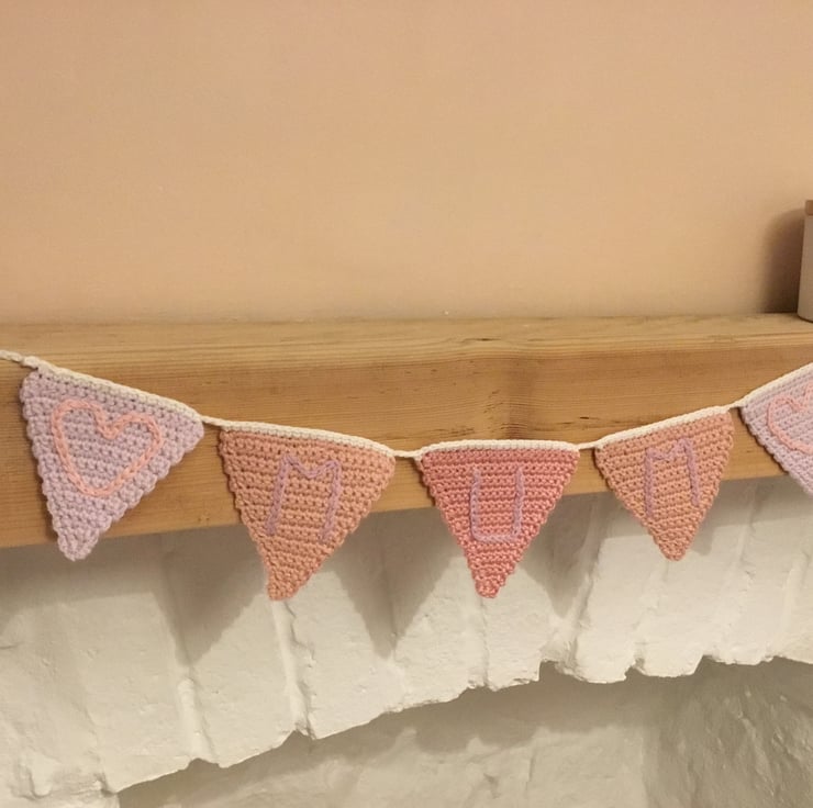Mum bunting with hearts, each triangle 10cm full bunting 54cm long, with a tie at each end, pastel colours