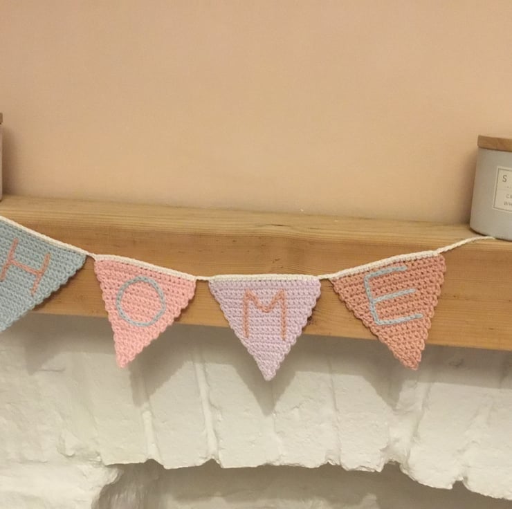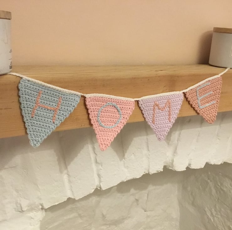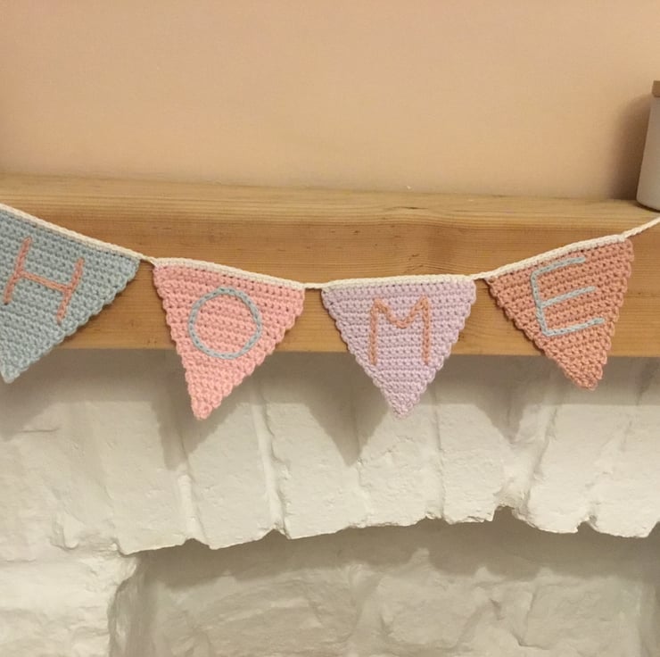 Home bunting, pale colours, each triangle 10cm full bunting length 43cm long with a tie each end
