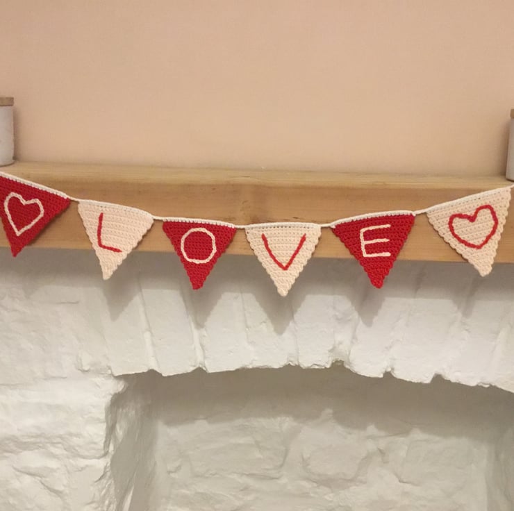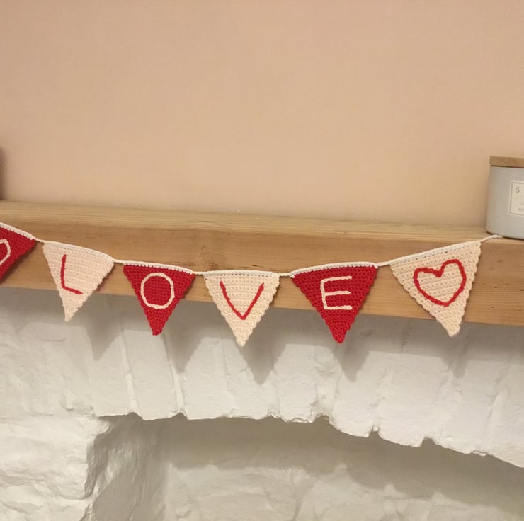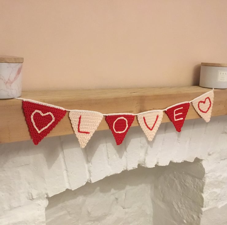 Love bunting with hearts, each triangle 10cm full bunting length 66cm with a tie each end