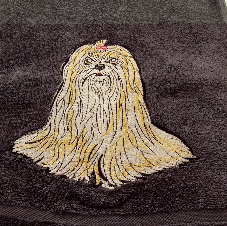 Machine Embroidered by me. Maltese Dog design machine embroidered Bath Towel. Slate. Towel measures 70cm x 137cm. 100% Turkish Cotton. t10