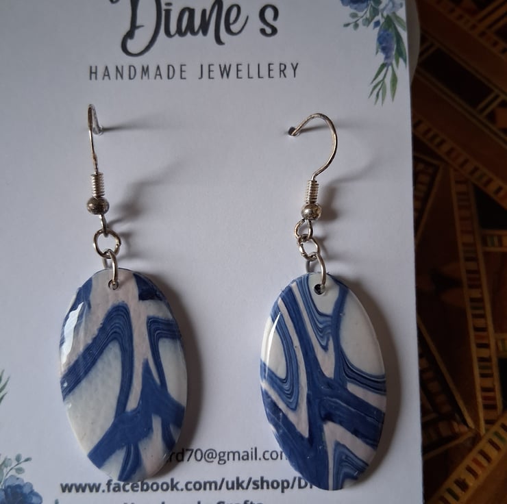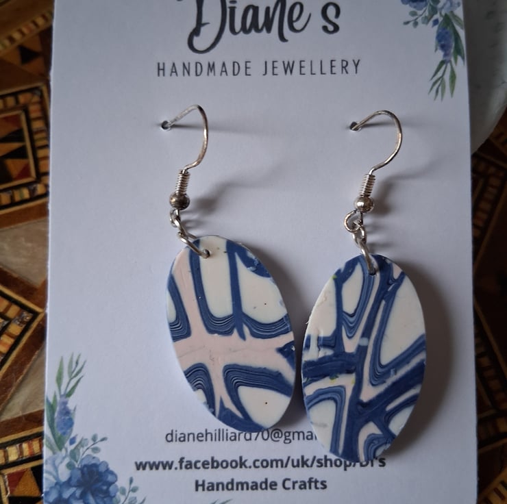 Oval blue and white earrings with a faint pink of pink. Made from polymer clay and topped with resin to give them a shine. 2cm wide, 4cm long from bottom of fish hook. Fish hooks are 925 sterling silver. Jump rings are silver plated. Very lightweight and easy to wear.