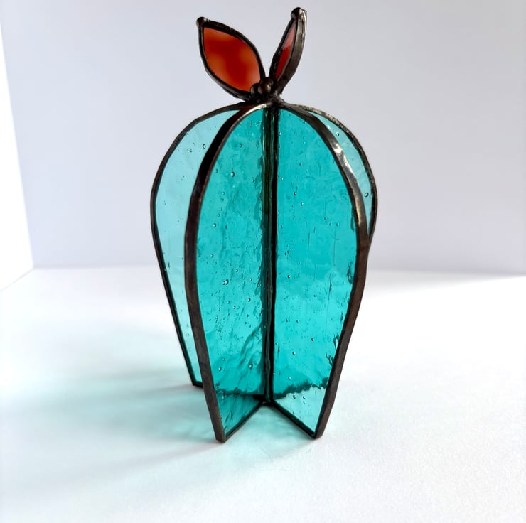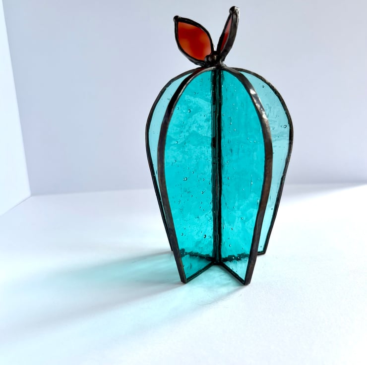 This everlasting joyful 3D stained glass cactus in bloom with a delicate red flower is an unique stained glass home decor which will get your dopamine flowing.