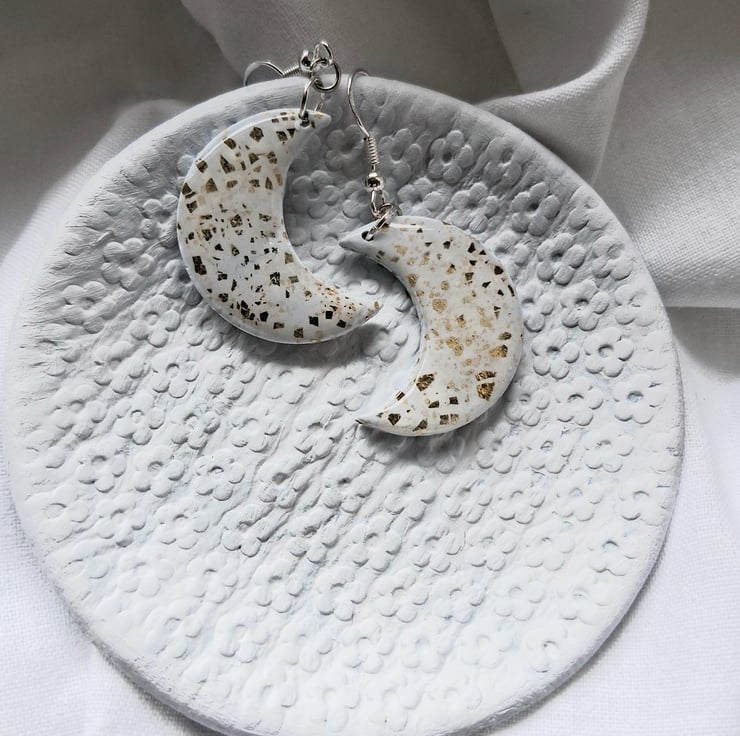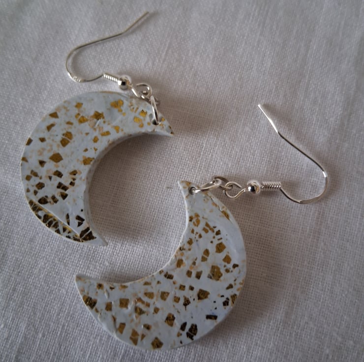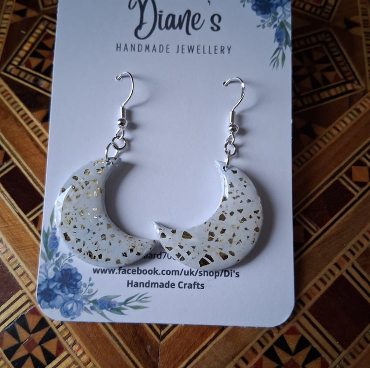 Handmade moon shape polymer clay earrings. Duck egg blue with gold leaf flecks. Coated with resin. Very lightweight. 925 sterling silver fish hooks. Jump rings are made of silver plate. 1.5cm wide x 3.5cm long from bottom of fish hook.