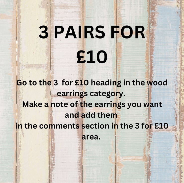 All wooden earrings are made to order. Price is £5 per pair of earrings. Add your choices in the 3 for £10 category if you want to take advantage of the offer.