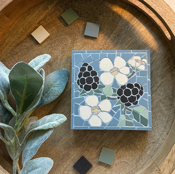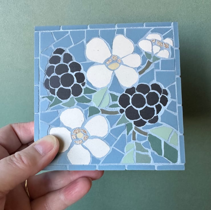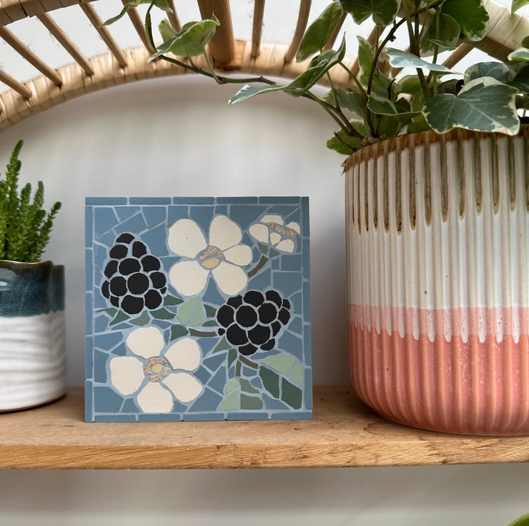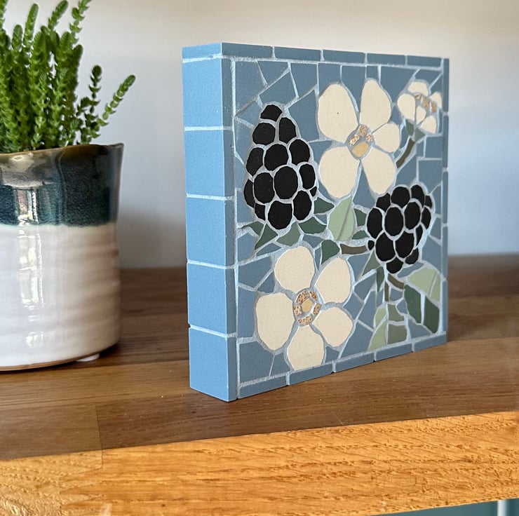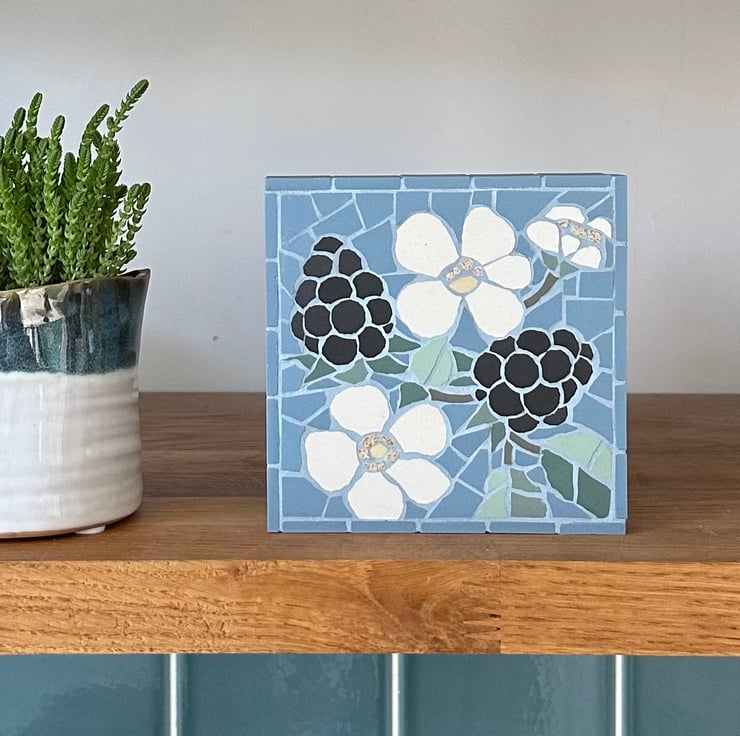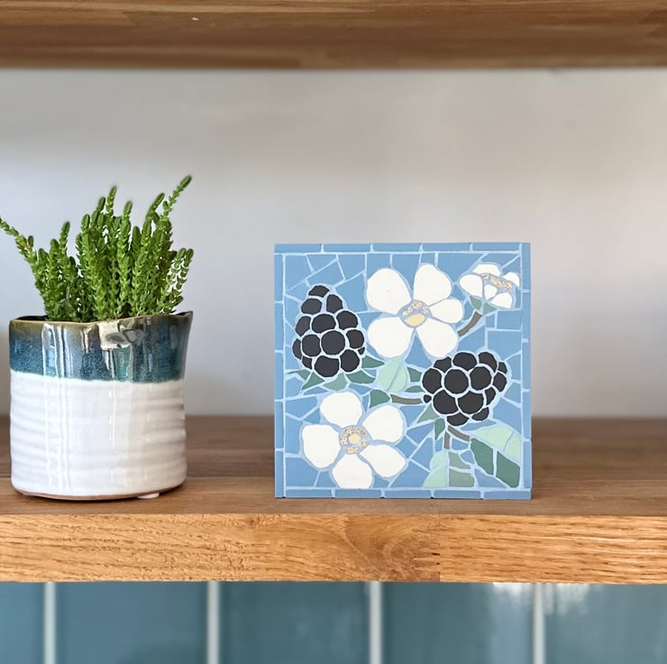 This original floral art is created in mosaic and features a blackberry bramble on a lovely bright blue background. The leaves are created in a variety of greens and the larger than life blackberries aer formed with hand cut circles of matt black tile. I also really enjoyed making the blossoms, and tried to emulate the feathery stamens by using speckled tiles.