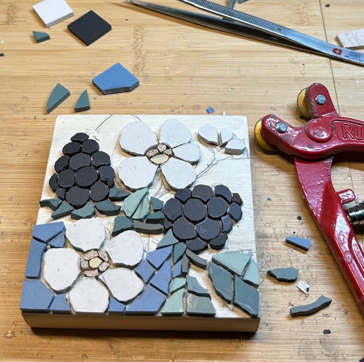 I use beautiful Winckelmans tiles which are matt ceramic and come in soft muted tones. I hand cut each piece of tessera to create intricate images inspired by nature. The mosaic is mounted on a wooden canvas and the sides are part tiled to frame the plaque and give depth and is complete with hanging wire. These chunky mosaics also stand on their own and look great on a shelf with your other favourite things.