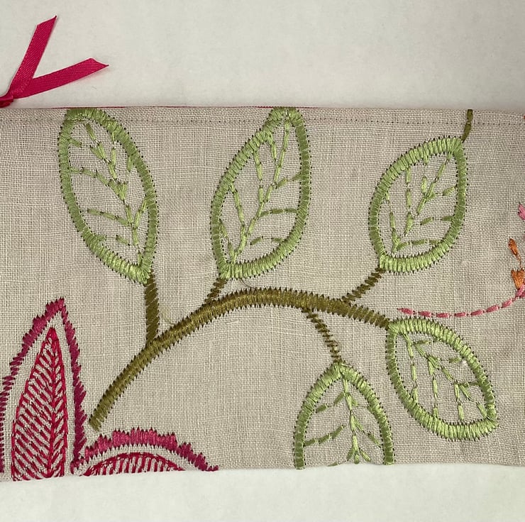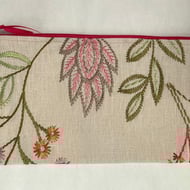 Simple zipped make up bag or pencil case, ecru linen embroidered with flowers and leaves. It has a pink zip and is lined with calico. Approximately 27cm x 14.5cm.
