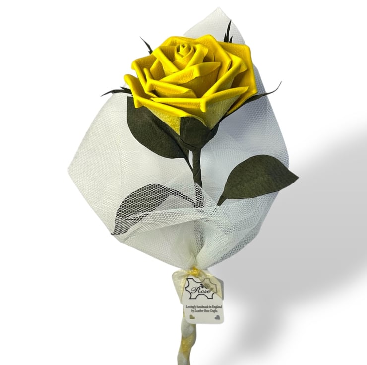 Bright, joyful and everlasting – a handcrafted yellow leather rose designed to bring warmth and happiness to any space.