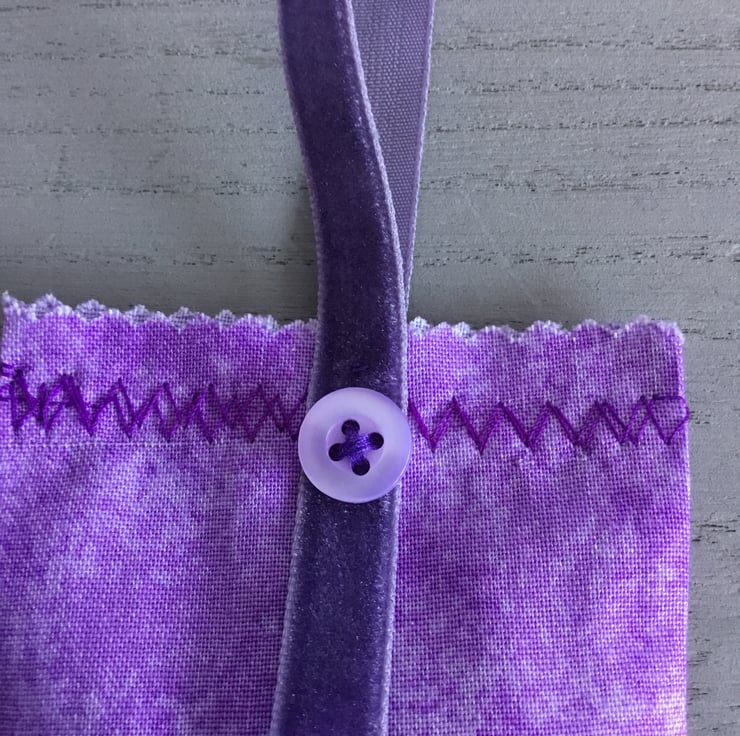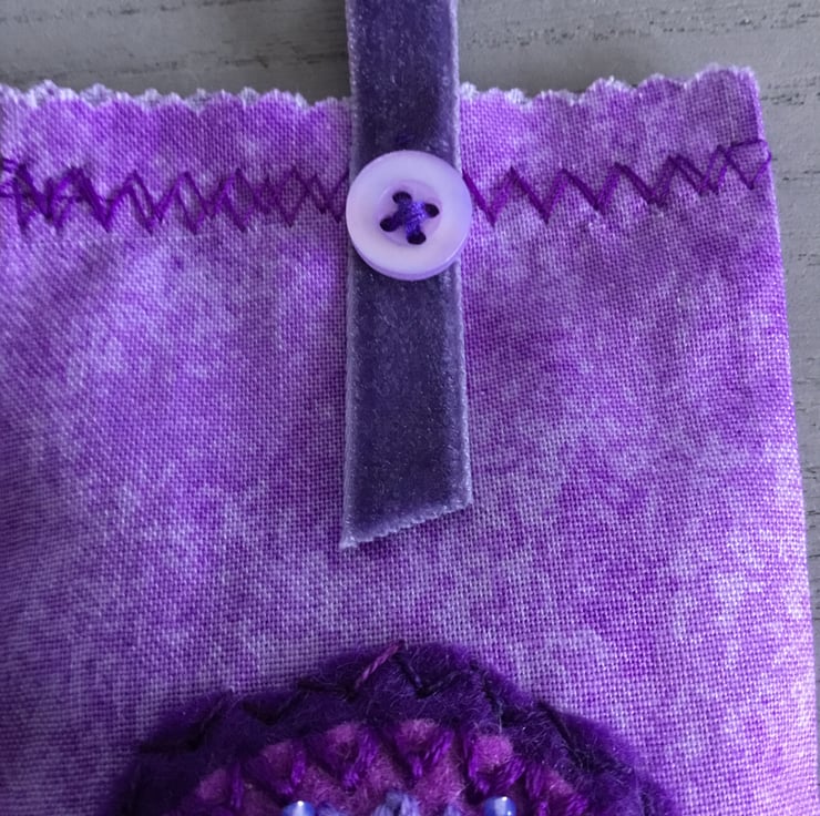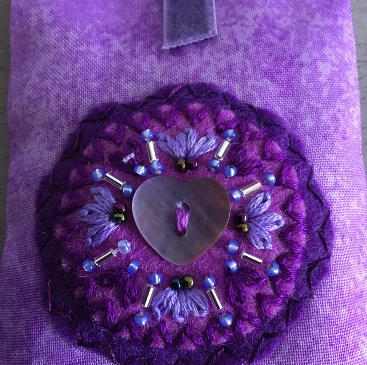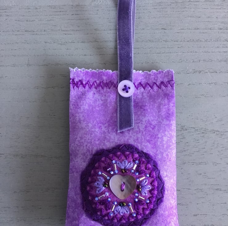 This Hand Embroidered Heart Lavender Bag has a pearlised lilac Heart shaped shell button sewn onto circles of purple felt. Hand Embroidered Lazy Daisy Stitches, bugle and seed beads radiate from this Heart button. This embroidery is sewn onto a marled lilac cotton bag, with a velvet ribbon hanging loop, secured with a button at the top.