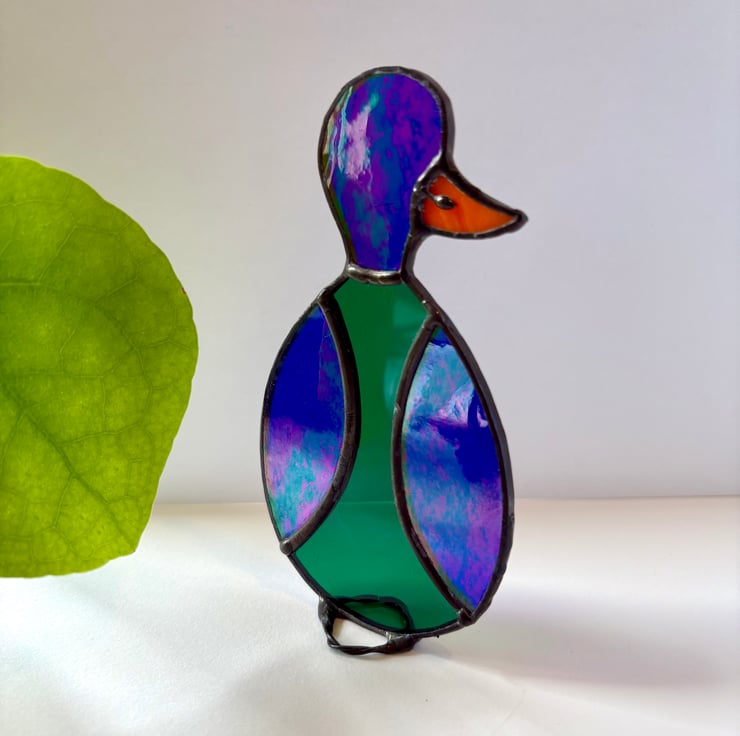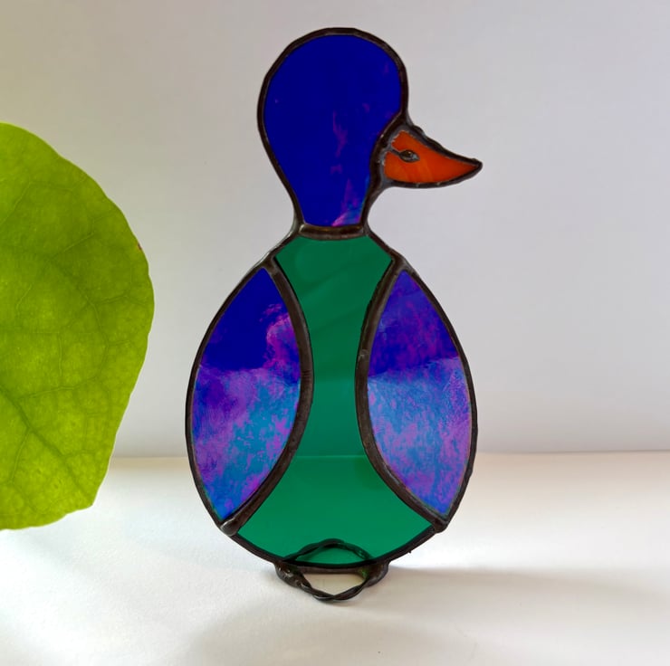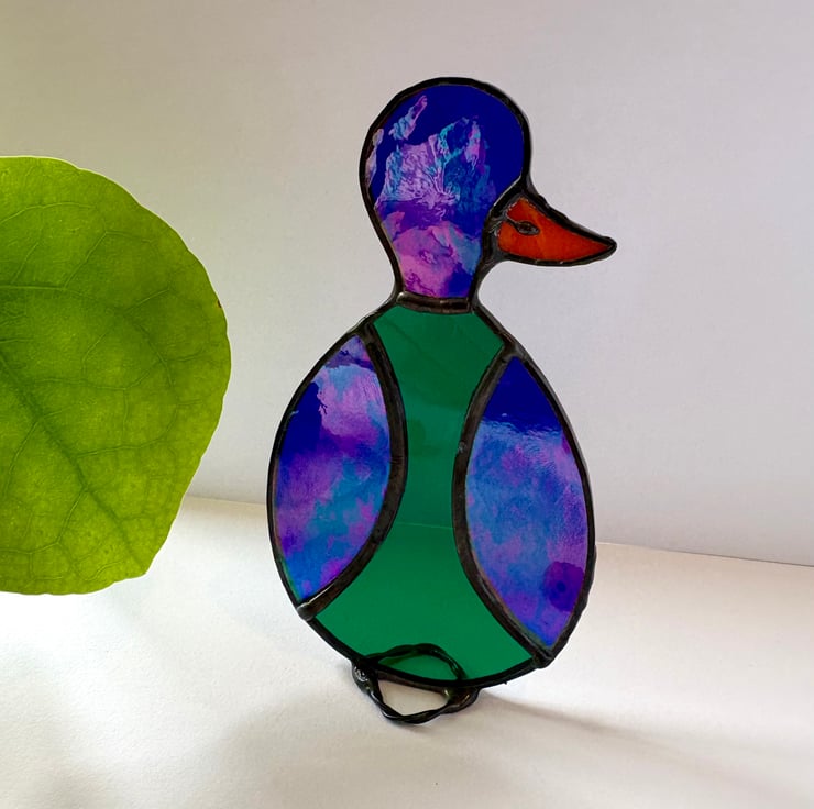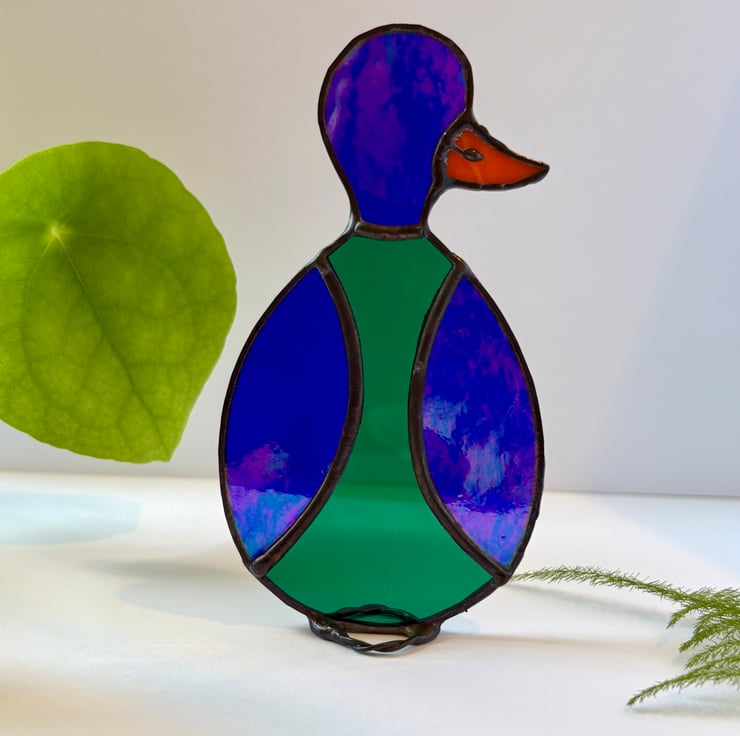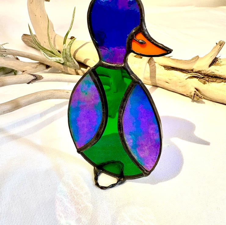 This is a 3D stained glass mallard duck designed and handmade in Scotland. I used some gorgeous iridescent stained glass for the wings to reflect the coloring of a male mallard bird. This a perfect farmhouse or countryside decoration that can be perched on a windowsill, shelf or a desk. This stained glass mallard will make an unique gift for any bird lover.
