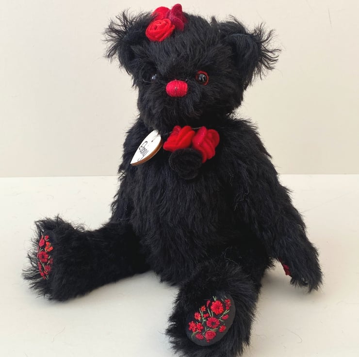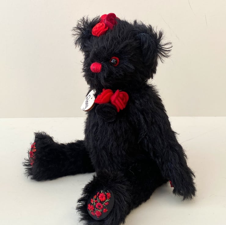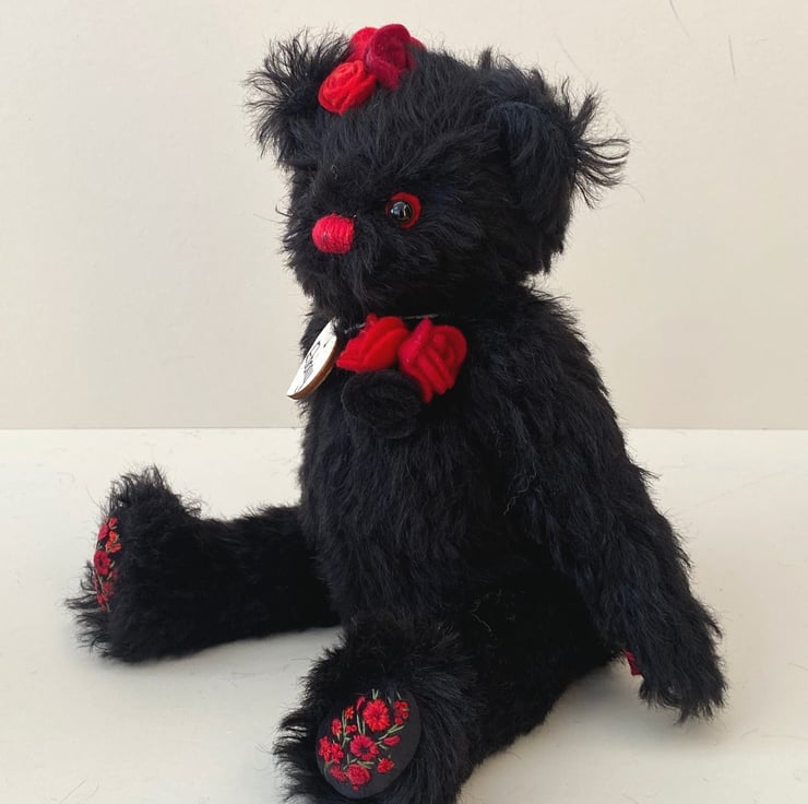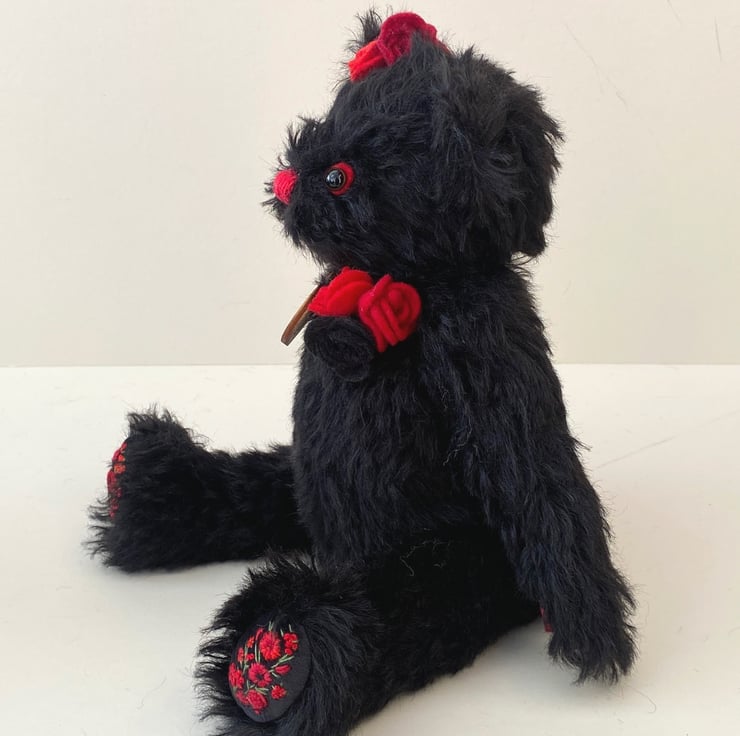 Ebony, handcrafted from Helmbold 20mm whirl mohair in black with faux cashmere hand embroidered paw pads. She has detailed paw pads which have been hand embroidered with red roses.