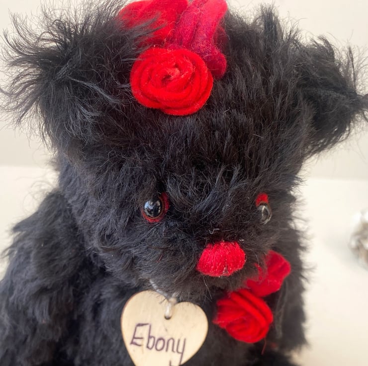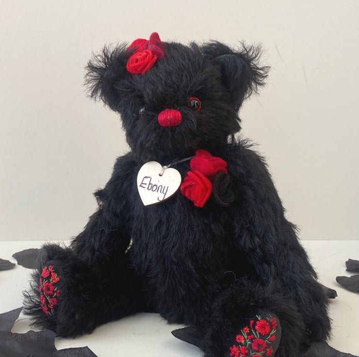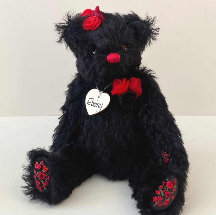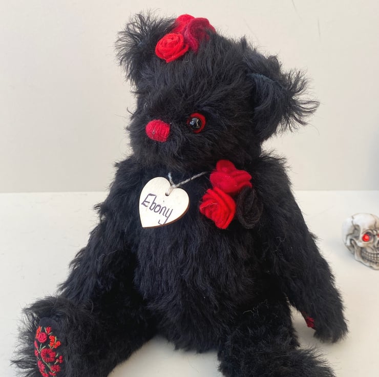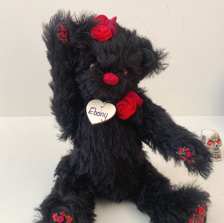 Meet Ebony, a Goth inspired luxury mohair artist bear with hand embroidery and wool felt roses.